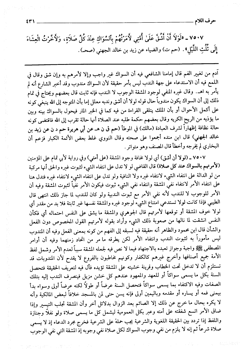 7507 - (لولا أن أشق) أي لولا مخافة وجود المشقة (على أمتي) وفي رواية لأبي تمام على المؤمنين (لأمرتهم بالسواك عند كل صلاة) قال القاضي : لولا تدل على انتفاء الشئ لثبوت غيره والحق أنها مركبة من لو الدالة على انتفاء الشئ لانتفاء غيره ولا النافية ولو تدل على انتفاء الشئ لانتفاء غيره فتدل هنا على انتفاء الأمر لانتفاء نفي المشقة وانتفاء نفي الشئ ثبوت فيكون الأمر نفيا لثبوت المشقة [ ص 339 ] وفيه أن الأمر للوجوب لا للندب لأنه نفي الأمر مع ثبوت الندبية ولو كان للندب لما جاز ذلك انتهى.