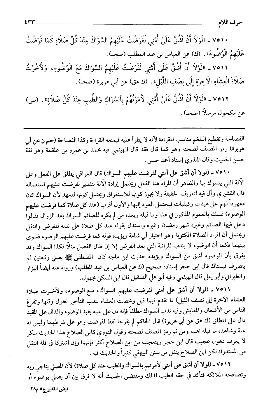 7510 - (لولا أن أشق على أمتي لفرضت عليهم السواك) قال العراقي : يطلق على الفعل وعلى الآلة التي يتسوك بها والظاهر أن المراد هنا الفعل ويحتمل إرادة الآلة بتقدير لفرضت عليهم استعماله قال القشيري : وأل فيه لتعريف الحقيقة ولا يجوز كونها للاستغراق ويحتمل كونها للعهد لأن السواك كان معهودا لهم على هيئات وكيفيات فيحتمل العود إليها والأول أقرب (عند كل صلاة كما فرضت عليهم الوضوء) تمسك بالعموم المذكور في هذا وما قبله وبعده من لم يكره للصائم السواك بعد الزوال فقالوا دخل فيها الصائم وغيره شهر رمضان وغيره واستدل بقوله عند كل صلاة على ندبه للفرض والنفل ويحتمل أن المراد الصلاة المكتوبة وهو اختيار أبي شامة ويؤيده قوله كما فرضت عليهم الوضوء فسوى بينهما فكما أن الوضوء لا يندب للراتبة التي بعد الفرض إلا إن طال الفصل مثلا فكذا السواك وقد يفرق بأن الوضوء أشق من السواك ويؤيده حديث ابن ماجه كان المصطفى صلى الله عليه وسلم يصلي ركعتين ثم ينصرف فيستاك قال ابن حجر : إسناده صحيح.