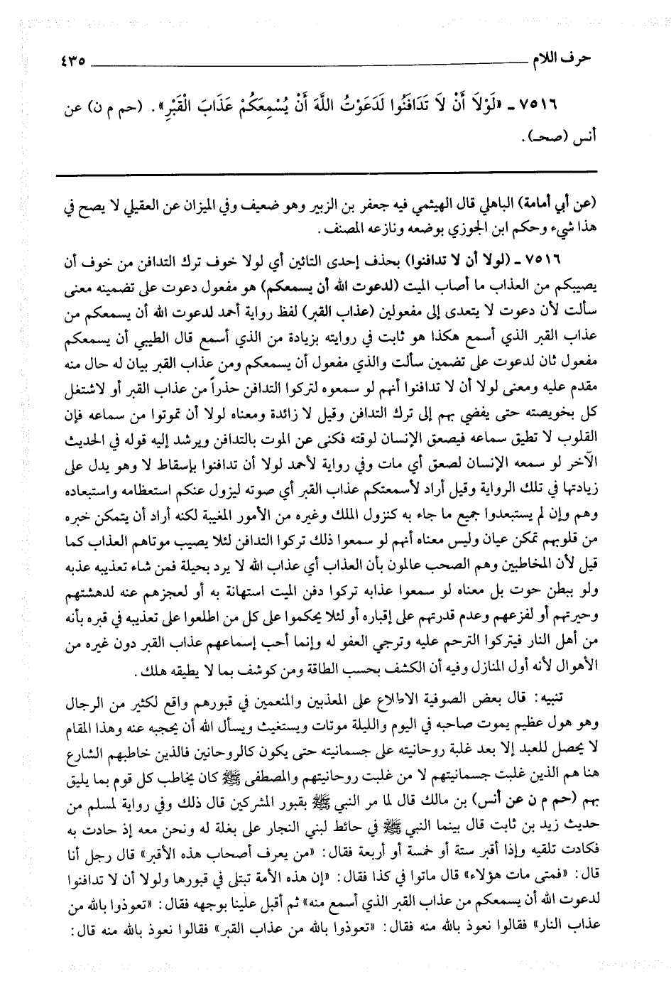 7516 - (لولا أن لا تدافنوا) بحذف إحدى التاءين أي لولا خوف تر التدافن من خوف أن يصيبكم من العذاب ما أصاب الميت (لدعوت الله أن يسمعكم) هو مفعول دعوت على تضمينه معنى سألت لأن دعوت لا يتعدى إلى مفعولين (عذاب القبر) لفظ [ ص 342 ] رواية أحمد لدعوت الله أن يسمعكم من عذاب القبر الذي أسمع هكذا هو ثابت في روايته بزيادة من الذي أسمع قال الطيبي : أن يسمعكم مفعول ثان لدعوت على تضمين سألت والذي مفعول أن يسمعكم ومن عذاب القبر بيان له حال منه مقدم عليه ومعنى لولا أن لا تدافنوا أنهم لو سمعوه لتركوا التدافن حذرا من عذاب القبر أو لاشتغل كل بخويصته حتى يفضى بهم إلى ترك التدافن وقيل لا زائدة ومعناه لولا أن تموتوا من سماعه فإن القلوب لا تطيق سماعه فيصعق الإنسان لوقته فكنى عن الموت بالتدافن ويرشد إليه قوله في الحديث