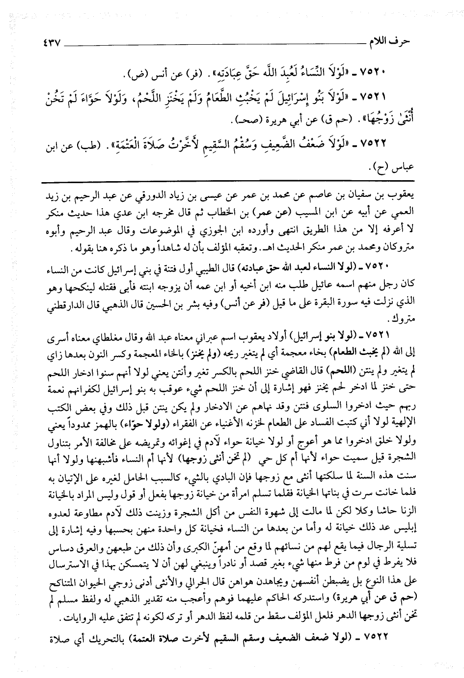 7520 - (لولا النساء لعبد الله حق عبادته) قال الطيبي : أول فتنة في بني إسرائيل كانت من النساء كان رجل منهم اسمه عائيل طلب منه ابن أخيه أو ابن عمه أي يزوجه ابنته فأبى فقتله لينكحها وهو الذي نزلت به سورة البقرة على ما قيل.