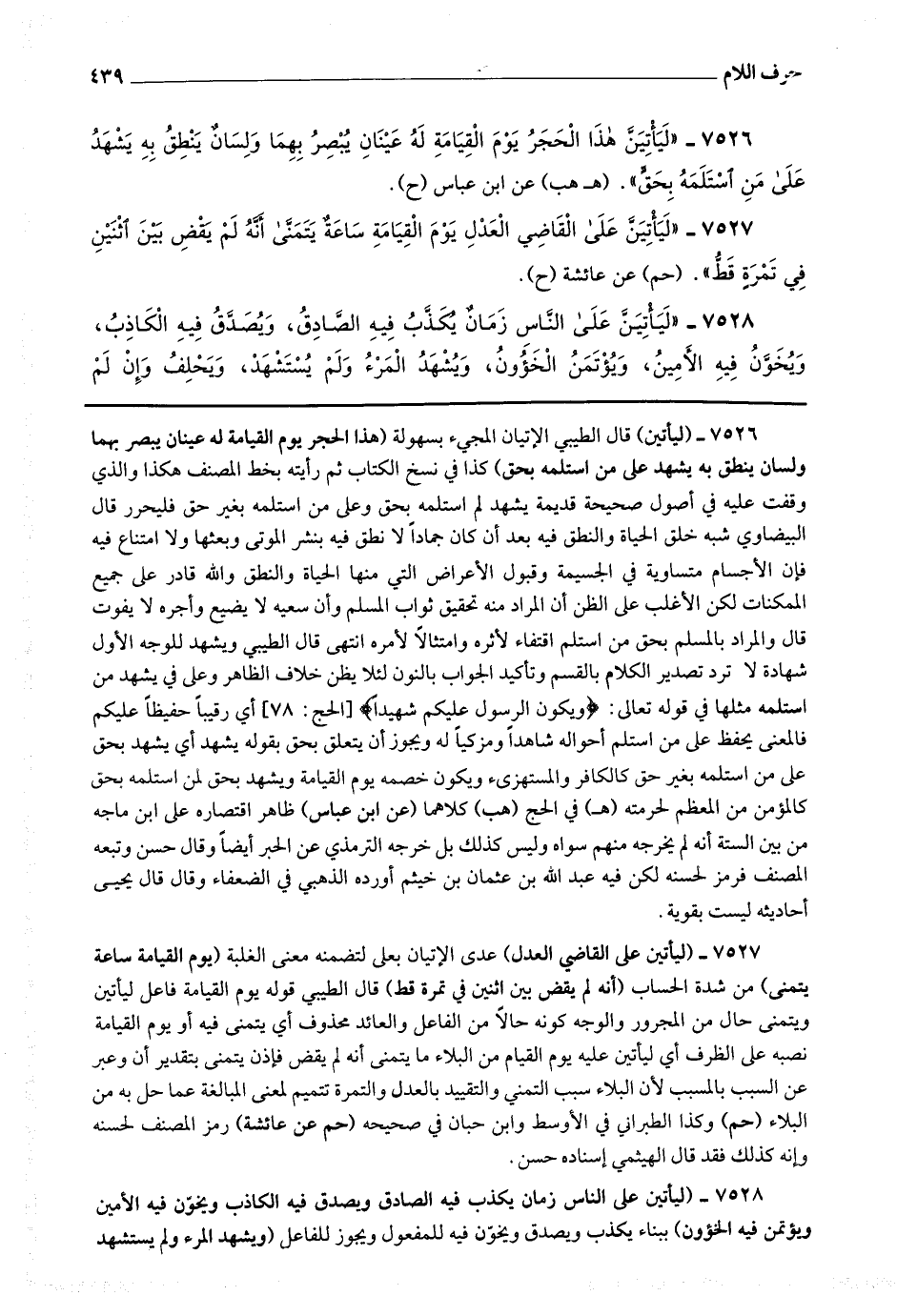 7526 - (ليأتين) قال الطيبي : الإتيان المجئ بسهولة (هذا الحجر يوم القيامة له عينان يبصر بهما ولسان ينطق به يشهد على من استلمه بحق) كذا في نسخ الكتاب ثم رأيته بخط المصنف هكذا والذي وقفت عليه في أصول صحيحة قديمة يشهد لمن استلمه بحق وعلى من استلمه بغير حق فليحرر قال البيضاوي : شبه خلق الحياة والنطق فيه بعد أن كان جمادا لا نطق فيه بنشر الموتى وبعثها ولا امتناع فيه فإن الأجسام متساوية في الجسمية وقبول الأعراض التي منها الحياة والنطق والله قادر على جميع الممكنات لكن الأغلب على الظن أن المراد منه تحقيق ثواب المسلم وأن سعيه لا يضيع وأجره لا يفوت ، قال : والمراد بالمسلم بحق من استلم اقتفاء لأثره وامتثالا لأمره انتهى.