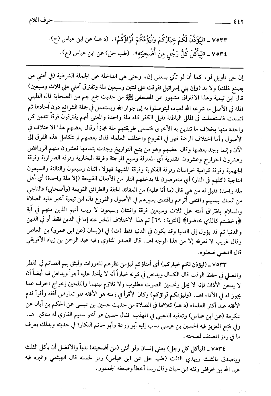 إن على تأويل لو ، كما أن لو تأتي بمعنى إن ، وحتى هي الداخلة على الجملة الشرطية (في أمتي من يصنع ذلك) ولا بد (وإن بني إسرائيل تفرقت على ثنتين وسبعين ملة وتفترق أمتي على ثلاث وسبعين) قال ابن تيمية : وهذا الافتراق مشهور عن المصطفى صلى الله عليه وسلم من حديث جمع جم من الصحابة قال الطيبي : الملة في الأصل ما شرعه الله لعباده ليتوصلوا به إلى جوار الله ويستعمل في جملة الشرائع دون آحادها ثم
