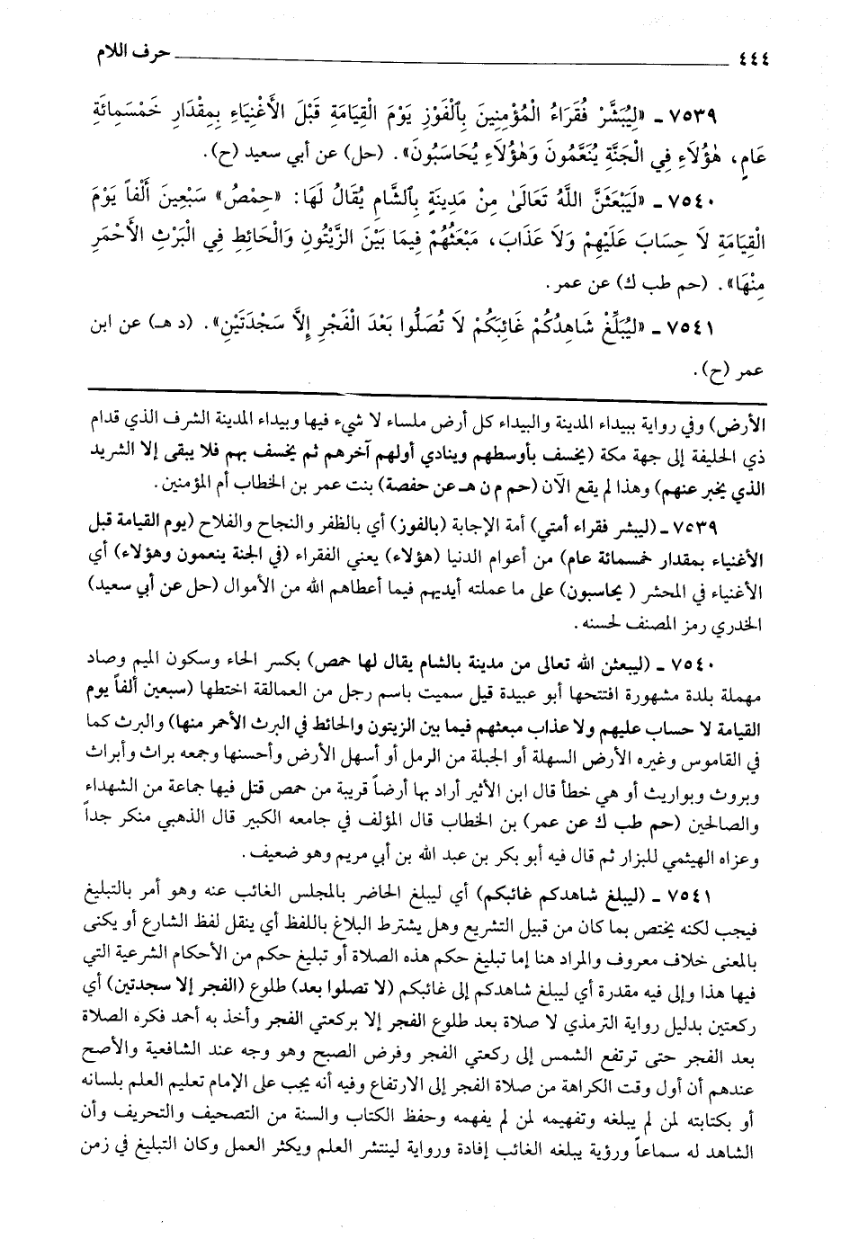 7541 - (ليبلغ شاهد غائبكم) أي ليبلغ الحاضر بالمجلس الغائب عنه وهو أمر بالتبليغ فيجب لكنه يختص بما كان من قبيل التشريع وهل يشترط البلاغ باللفظ أي ينقل الشارع أو يكنى بالمعنى خلاف معروف والمراد هنا إما تبليغ حكم هذه الصلاة أو تبليغ حكم من الأحكام الشرعية التي فيها هذا وإلى فيه مقدرة أي ليبلغ شاهدكم إلى غائبكم (لا تصلوا بعد) طلوع (الفجر إلا سجدتين) أي ركعتين بدليل رواية الترمذي لا صلاة بعد طلوع الفجر إلا بركعتي الفجر وأخذ به أحمد فكره الصلاة