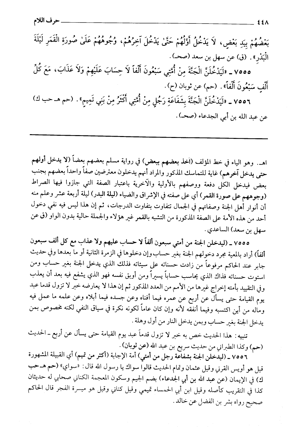 7555 - (ليدخلن الجنة من أمتي سبعون ألفا لا حساب عليهم ولا عذاب مع كل ألف سبعون ألفا) أراد بالمعية مجرد دخولهم الجنة بغير حساب وأن دخلوها في الزمرة الثانية أو ما بعدها وفي حديث جابر عند الحاكم مرفوعا من زادت حسناته على سيئاته فذلك الذي يدخل الجنة بغير حساب ومن استوت حسناته فذاك الذي يحاسب حسابا يسيرا ومن أوبق نفسه فهو الذي يشفع فيه بعد أن يعذب وفي التقييد بأمته إخراج غيرها من الأمم من العدد المذكور ثم إن هذا لا يعارضه خبر لا تزول قدما عبد يوم القيامة حتى يسأل عن أربع عن عمره فيما أفناه وعن جسده فيما أبلاه وعن علمه ما عمل فيه وماله من أين اكتسبه وفيما أنفقه لأنه وإن كان عاما لكونه نكرة في سياق النفي لكنه مخصوص بمن يدخل الجنة بغير حساب وبمن يدخل النار من أول وهلة تنبيه : هذا الحديث خص به خبر لا تزول قدما عبد يوم القيامة حتى يسأل عن أربع - الحديث.