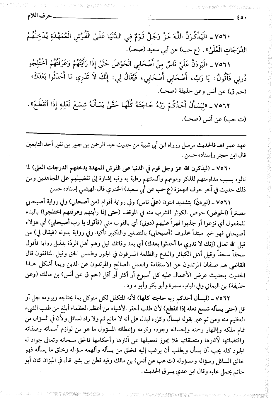 7560 - (ليذكرن الله عز وجل قوم في الدنيا على الفرش الممهدة يدخلهم الدرجات العلى) لما نالوه بسبب مداومتهم للذكر وموتهم وألسنتهم رطبة به وفيه إشارة إلى تفضيلهم على المجاهدين ومن ذلك حديث في آخر حرف الهمزة.