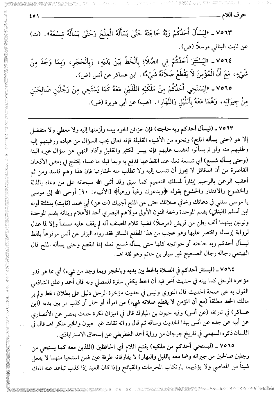 7563 - (ليسأل أحدكم ربه حاجته) فإن خزائن الجود بيده وأزمتها إليه ولا معطي ولا متفضل إلا هو (حتى يسأله الملح) ونحوه من الأشياء القليلة فإنه تعالى يحب السؤال من عباده ورغبتهم إليه وطلبهم منه ولو لم يسألوا لغضب عليهم فإنه ييسر الكثير والقليل وأفاد النهي عن سؤال غيره ألبتة (وحتى يسأله شسع) أي شسعه نعله عند انقطاعها فدفع به وبما قبله ما عساه يختلج في بعض الأذهان القاصرة من أن الدقائق لا يجوز أن تنسب إليه ولا تطلب منه لحقارتها فإن هذا وهم فاسد ومن ثم أعقب الرحمن بالرحيم إيثارا لمسلك التعميم كما سبق وقد أثنى الله سبحانه على من دعاه بالذلة والخضوع والافتقار والخشوع بقوله * (ويدعوننا رغبا ورهبا) * أوحى الله إلى موسى يا موسى سلني في دعائك وخافي صلاتك حتى عن الملح أجبيك.