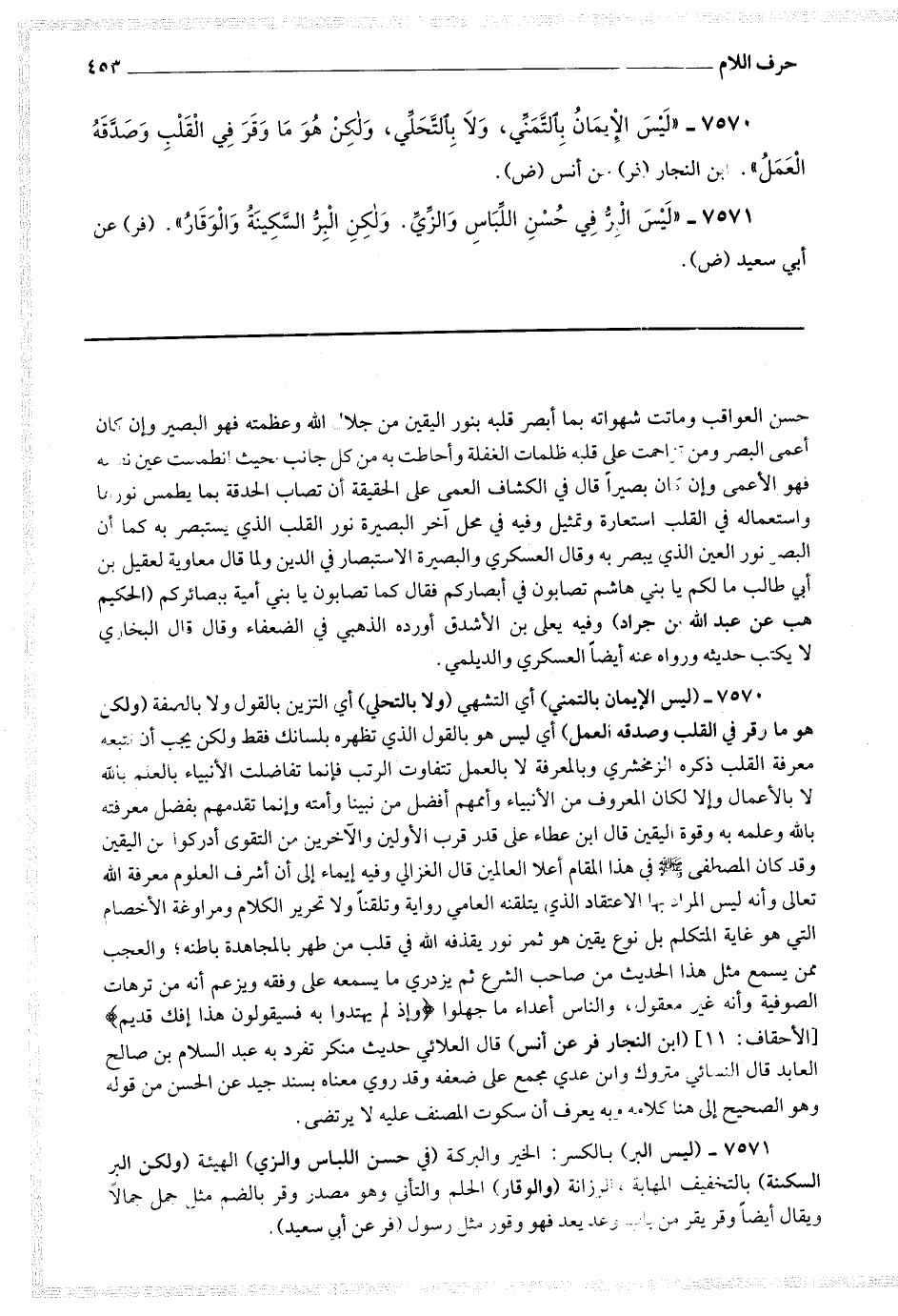 7571 - (ليس البر) بالكسر: الخير والبركة (في حسن اللباس والزي) الهيئة (ولكن البر السكينة) بالتخفيف المهابة والرزانة (والوقار) الحلم والتأني وهو مصدر وقر بالضم مثل جمل جمالا ويقال أيضا وقر يقر من باب وعد يعد فهو وقور مثل رسول.