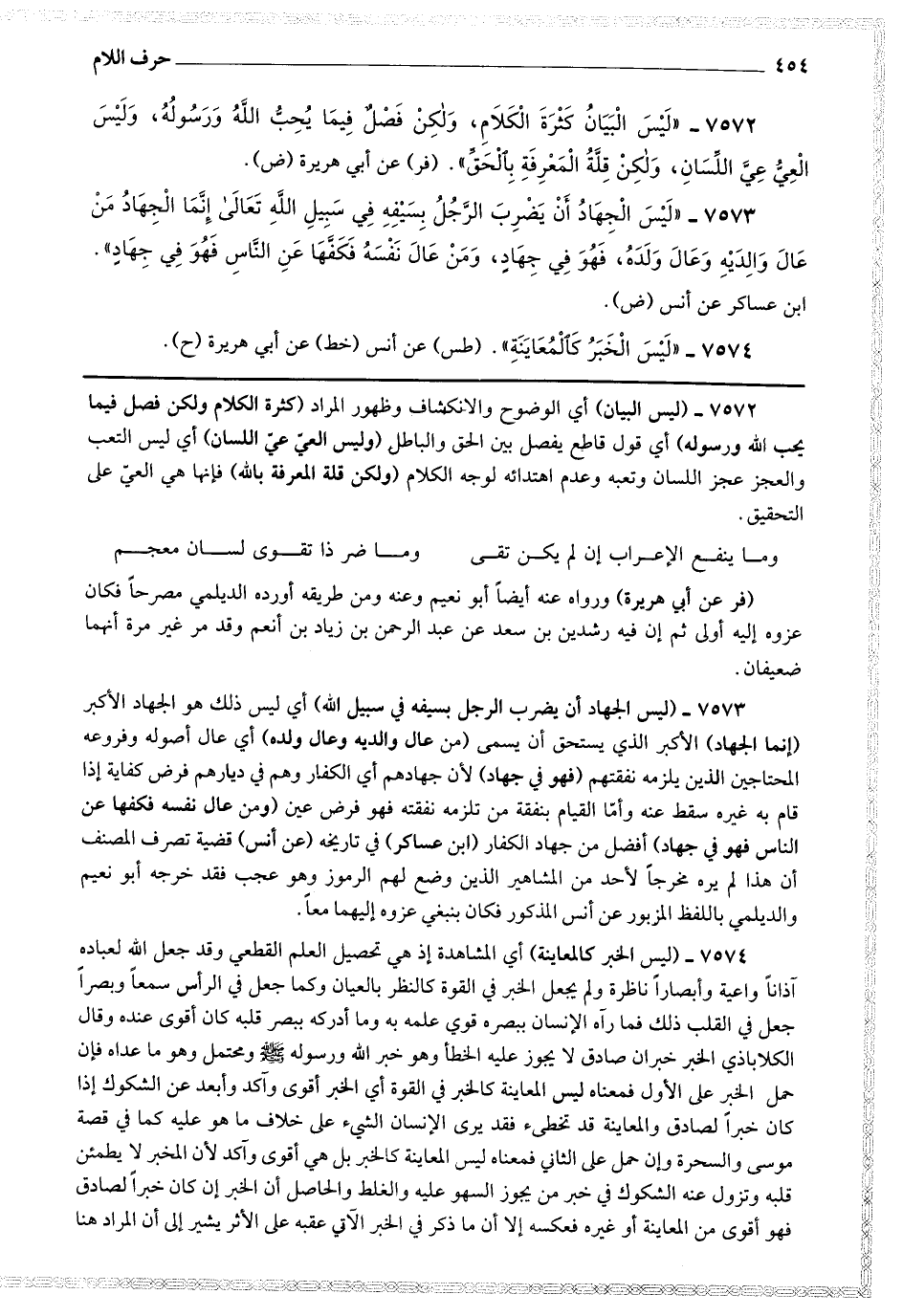 7572 - (ليس البيان) أي الوضوح والانكشاف وظهور المراد (كثرة الكلام ولكن فصل فيما يحب الله ورسوله) أي قول قاطع يفصل بين الحق والباطل (وليس العي عي اللسان) أي ليس التعب والعجز عجز اللسان وتعب وعدم اهتدائه لوجه الكلام (ولكن قلة المعرفة بالله) فإنها هي العي على التحقيق : وما ينفع الإعراب إن لم يكن تقى * وما ضر ذا تقوى لسان معجم (فر عن أبي هريرة) ورواه عنه أيضا أبو نعيم وعنه وعن طريقه أورده الديلمي مصرحا فكان عزوه إليه أولى ثم إن فيه رشدين بن سعد عن عبد الرحمن بن زياد بن أنعم وقد مر غير مرة أنهما ضعيفان.