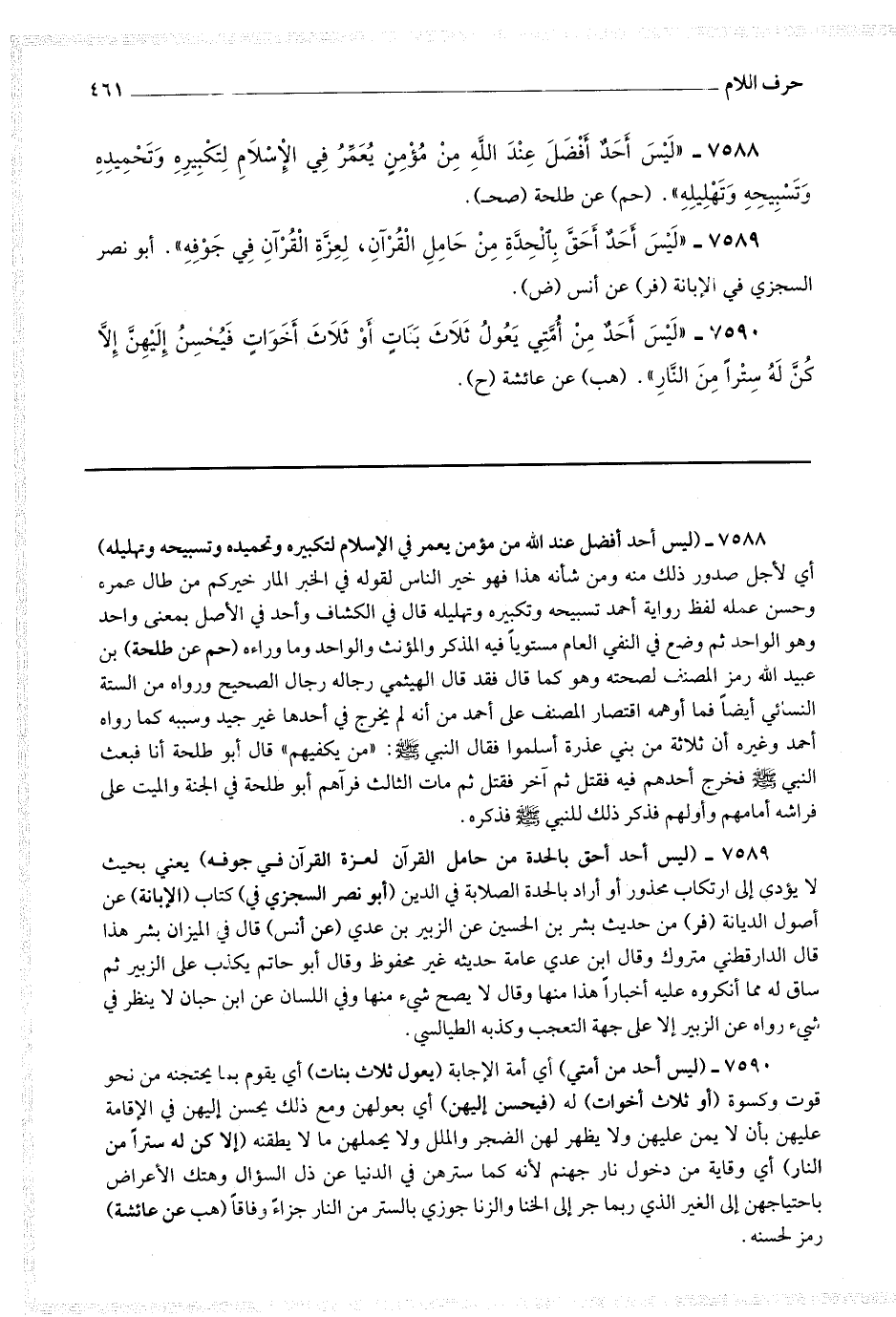 7588 - (ليس أحد أفضل عند الله من مؤمن يعمر في الإسلام لتكبيره وتحميده وتسبيحه وتهليله) أي لأجل صدور ذلك منه ومن شأنه هذا فهو خير الناس لقوله في الخبر المار خيركم من طال عمره وحسن عمله لفظ رواية أحمد تسبيحه وتكبيره وتهليله قال في الكشاف : وأحد في الأصل بمعنى واحد وهو الواحد ثم وضع في النفي العام مستويا فيه المذكر والمؤنث والواحد وما وراءه.