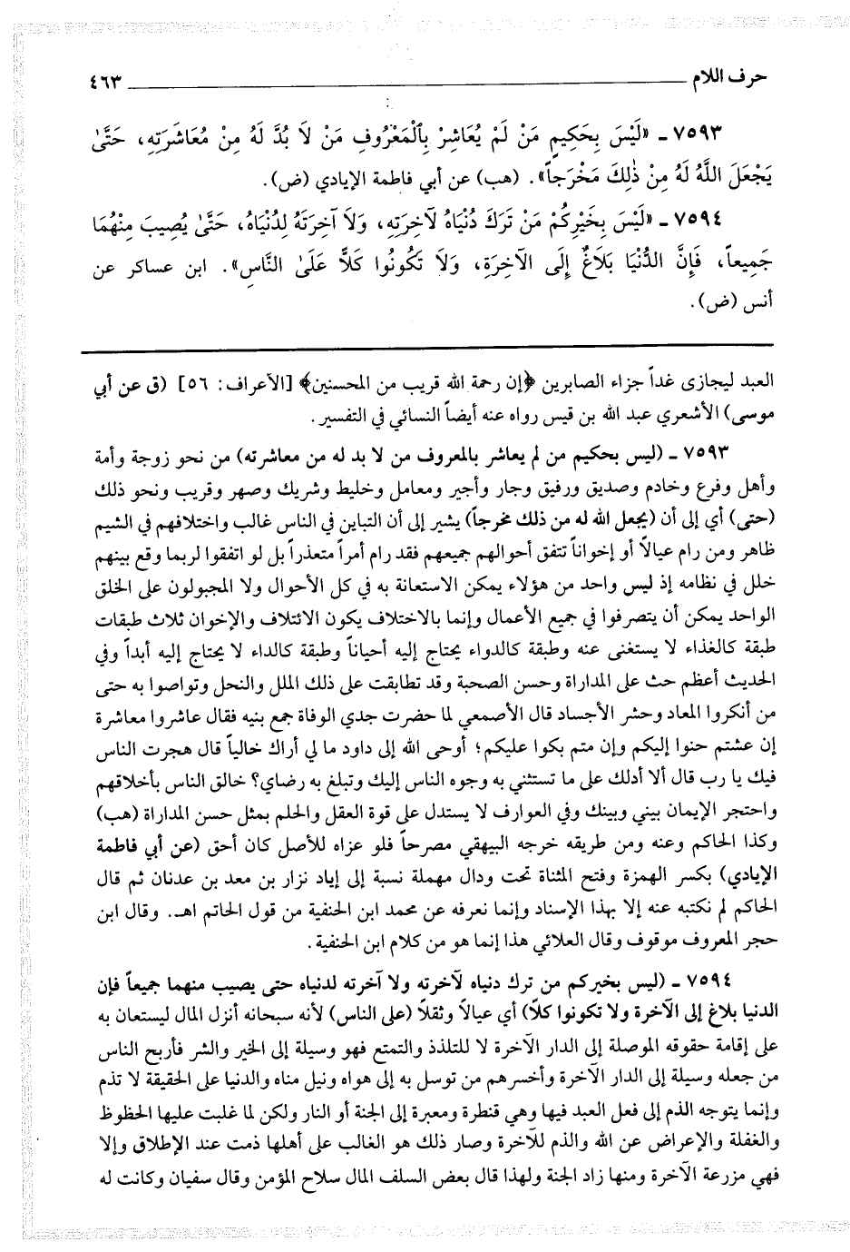 7594 - (ليس بخيركم من ترك دنياه لآخرته ولا آخرته لدنياه حتى يصيب منهما جميعا فإن الدنيا بلاغ إلى الآخرة ولا تكونوا كلا) أي عيالا وثقلا (على الناس) لأنه سبحانه أنزل المال ليستعان به على إقامة حقوقه الموصلة إلى الدار الآخرة لا للتلذذ والتمتع فهو وسيلة إلى الخير والشر فأربح الناس من جعله وسيلة إلى الدار الآخرة وأخسرهم من توسل به إلى هواه ونيل مناه والدنيا على الحقيقة لا تذم