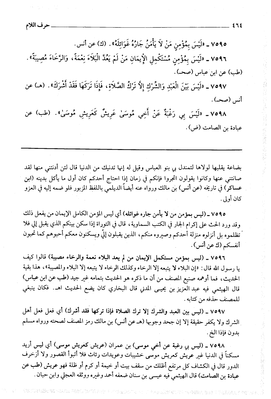 7596 - (ليس بمؤمن مستكمل الإيمان من لم يعد البلاء نعمة والرخاء مصيبة) قالوا : كيف يا رسول الله قال : إن البلاء لا يتبعه إلا الرخاء وكذلك الرخاء لا يتبعه إلا البلاء والمصيبة ، هذا بقية الحديث ، فما أوهمه صنيع المصنف من أن ما ذكره هو الحديث بتمامه غير جيد.