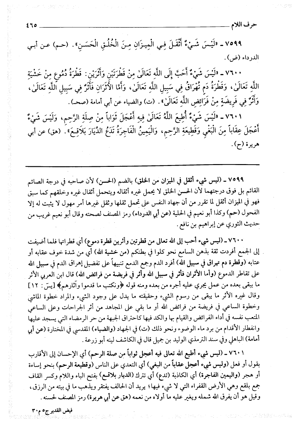 7600 - (ليس شئ أحب إلى الله تعالى من قطرتين وأثرين : قطرة دموع) أي قطراتها فلما أضيفت إلى الجمع أفردت ثقة بذهن السامع نحو كلوا في بطنكم (من خشية الله) أي من شدة خوف عقابه أو عتابه (وقطرة دم تهراق في سبيل الله) أفرد الدم وجمع الدمع تنبيها على تفضيل إهراق الدم في سبيل الله على تقاطر الدموع (وأما الأثران فأثر في سبيل الله وأثر في فريضة من فرائض الله) قال ابن العربي : الأثر ما يبقى بعده من عمل يجري عليه أجره من بعده ومنه قوله * (ونكتب ما قدموا وآثارهم) * وقال غيره : الأثر ما يبقى من رسوم الشئ وحقيقته ما يدل على وجود الشئ والمراد خطوة الماشي وخطوة الساعي في فريضة من فرائض الله أو ما بقي على المجاهد من أثر الجراحات وعلى الساعي المتعب نفسه في أداء الفرائض والقيام بها والكد فيها كاحتراق الجبهة من حر الرمضاء التي يسجد عليها وانفطار الأقدام من برد ماء الوضوء ونحو ذلك.