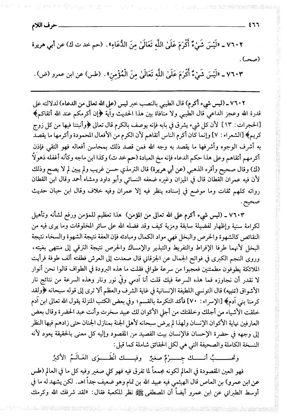 7602 - (ليس شئأكرم) قال الطيبي: بالنصب خبر ليس (على الله تعالى من الدعاء) لدلالته على قدرة الله وعجز [ص 366] الداعي قال الطيبي: ولا منافاة بين هذا الحديث وآية * (إن أكرمكم عند الله أتقاكم) * (الحجرات: 13) لأن كل شئ يشرق في بابه فإنه يوصف بالكرم قال تعالى * (وأنبتنا فيها من كل زوج كريم) * وإنما كان أكرم الناس أتقاهم لأن الكرم من الأفعال المحمودة وأكرمها ما يقصد به أشرف الوجوه وأشرفها ما يقصد به وجه الله فمن قصد ذلك بمحاسن أفعاله فهو التقي فإذن أكرمهم أتقاهم وعلى هذا حكم الدعاء فإنه مخ العبادة.