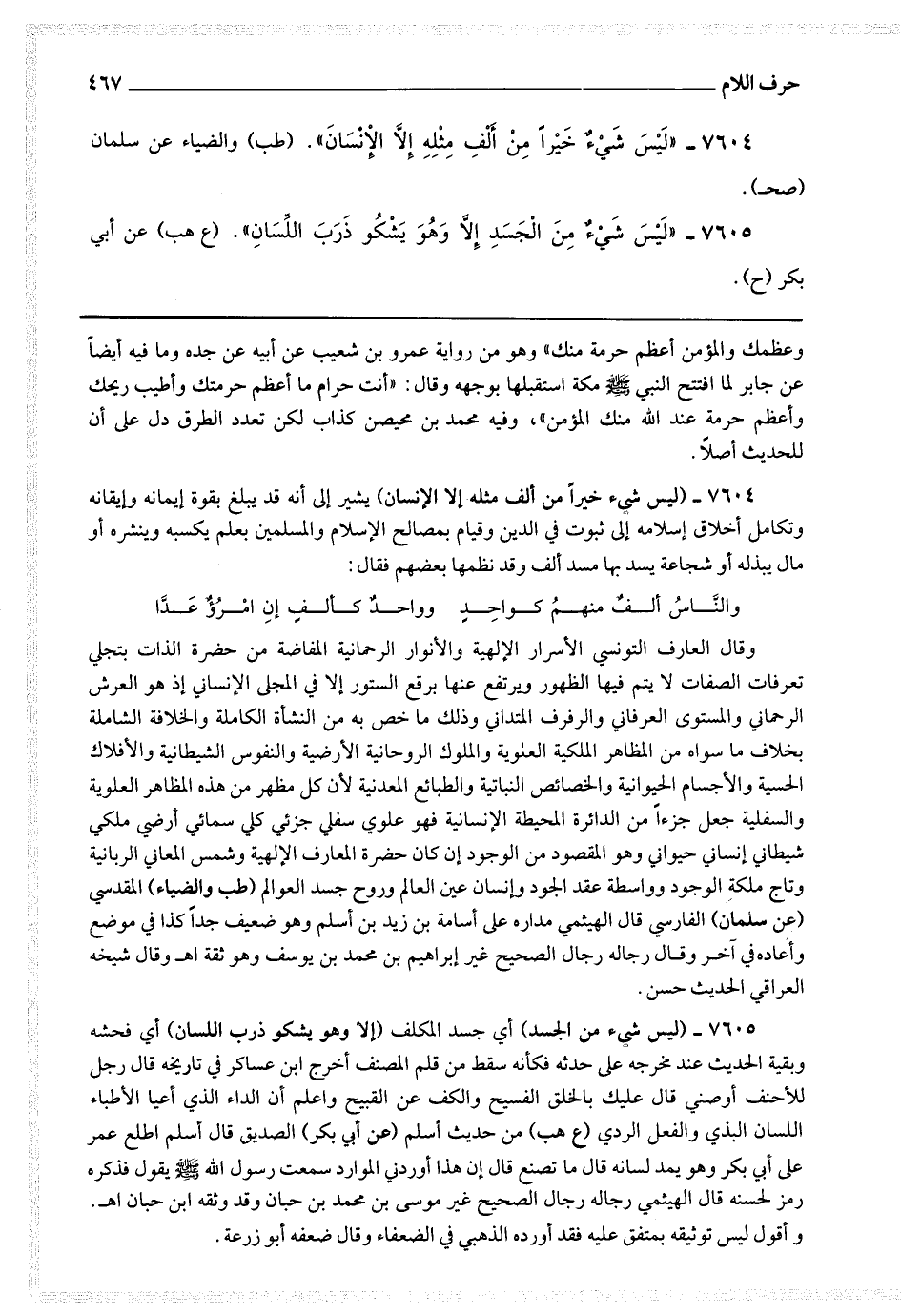 7604 - (ليس شئ خيرا من ألف مثله إلا الإنسان) يشير إلى أنه قد يبلغ بقوة إيمانه وإيقانه وتكامل أخلاق إسلامه إلى ثبوت في الدين وقيام بمصالح الإسلام والمسلمين بعلم يكسبه وينشره أو مال يبذله أو شجاعة يسد بها مسد ألف وقد نظمها بعضهم فقال : والناس ألف منهم كواحدا * وواحد كألف إن امرء عدا وقال العارف التونسي : الأسرار الإلهية والأنوار الرحمنية المفاضة من حضرة الذات بتجلي تعرفات الصفات لا يتم فيها الظهور ويرتفع عنها برقع الستور إلا في المجلى الإنساني إذ هو العرش الرحماني والمستوى العرفاني والرفرف المتداني وذلك ما خص به من النشأة الكاملة والخلافة الشاملة بخلاف ما سواه من المظاهر الملكية العلوية والملوك الروحانية [ ص 367 ] الأرضية والنفوس الشيطانية والأفلاك الحسية والأجسام الحيوانية والخصائص النباتية والطبائع المعدنية لأن كل مظهر من هذه المظاهر العلوية والسفلية جعل جزءا من الدائرة المحيطة الإنسانية فهو علوي سفلي جزئي كلي سمائي أرضي ملكي
