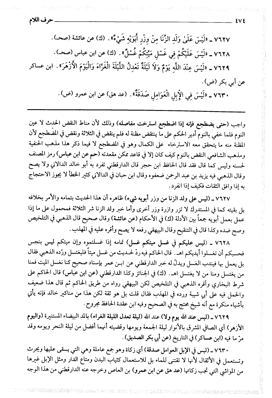 7630 - (ليس في الابل العوامل صدقة) أي زكاة وهو جمع عاملة وهي يسقى عليها ويحرث وتستعمل في الأثقال لأنها لا تفتني للنماء بل للاستعمال كثياب البدن ومتاع الدار ومثل الابل غيرها من المواشي التي تجب زكاتها.