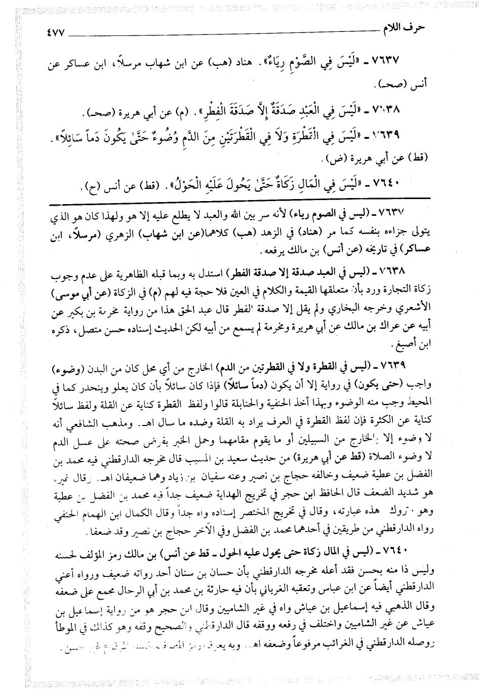 7638 - (ليس في العبد صدقة إلا صدقة الفطر) استدل به وبما قبله الظاهرية على عدم وجوب زكاة التجارة ورد بأن متعلقها القيمة والكلام في العين فلا حجة فيه لهم.