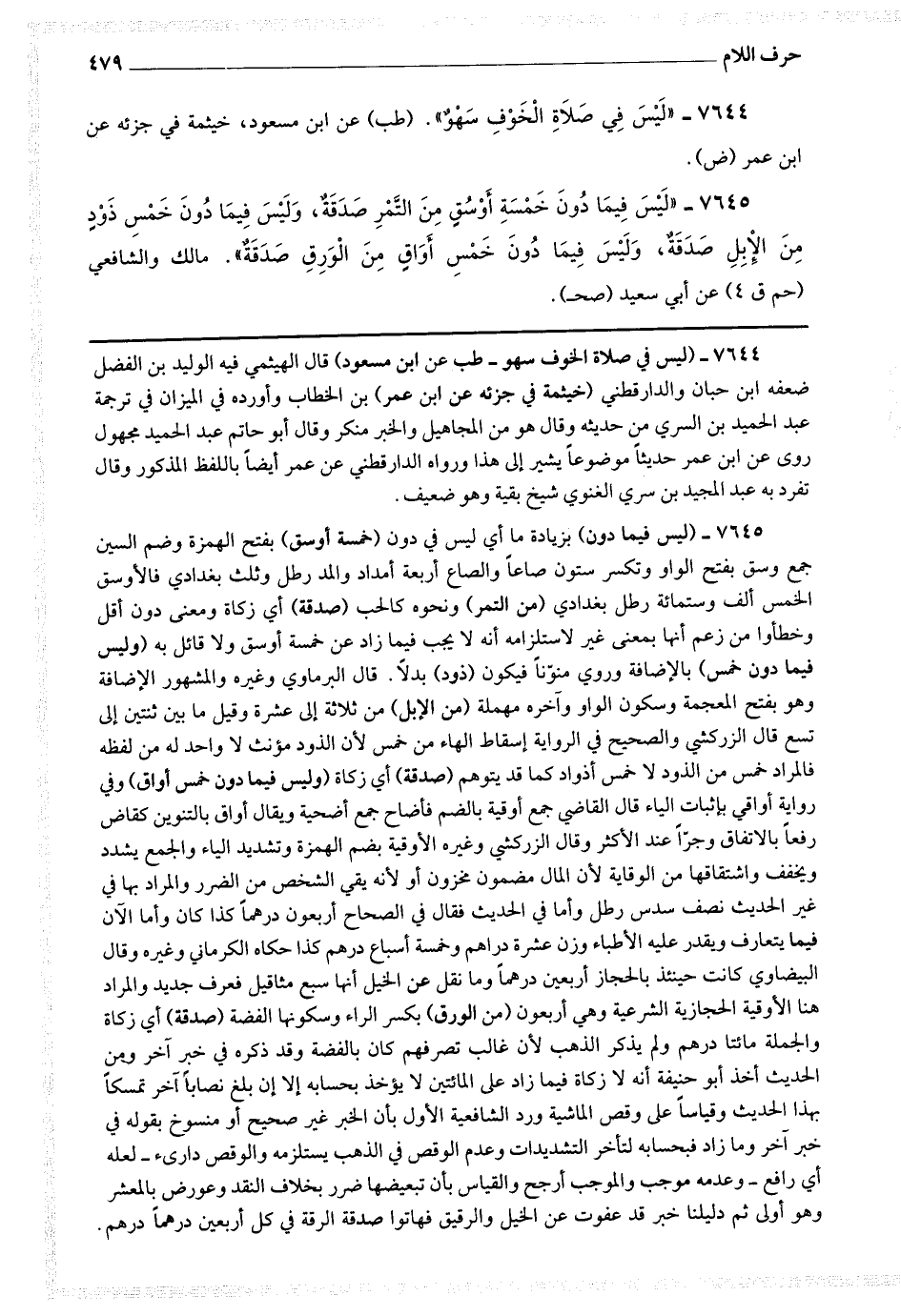 7645 - (ليس فيما دون) بزيادة ما أي ليس في دون (خمسة أوسق) بفتح الهمزة وضم السين جمع وسق بفتح الواو وتكسر ستون صاعا والصاع أربعة أمداد والمد رطل وثلث بغدادي فالأوسق الخمس ألف وستمائة رطل بغدادي (من التمر) ونحوه كالحب (صدقة) أي زكاة ومعنى دون أقل وخطأوا من زعم أنها بمعنى غير لاستلزامه أنه لا يجب فيما زاد عن خمسة أوسق ولا قائل به (وليس فيما دون خمس) بالإضافة ، وروي منونا فيكون (ذود) بدلا.