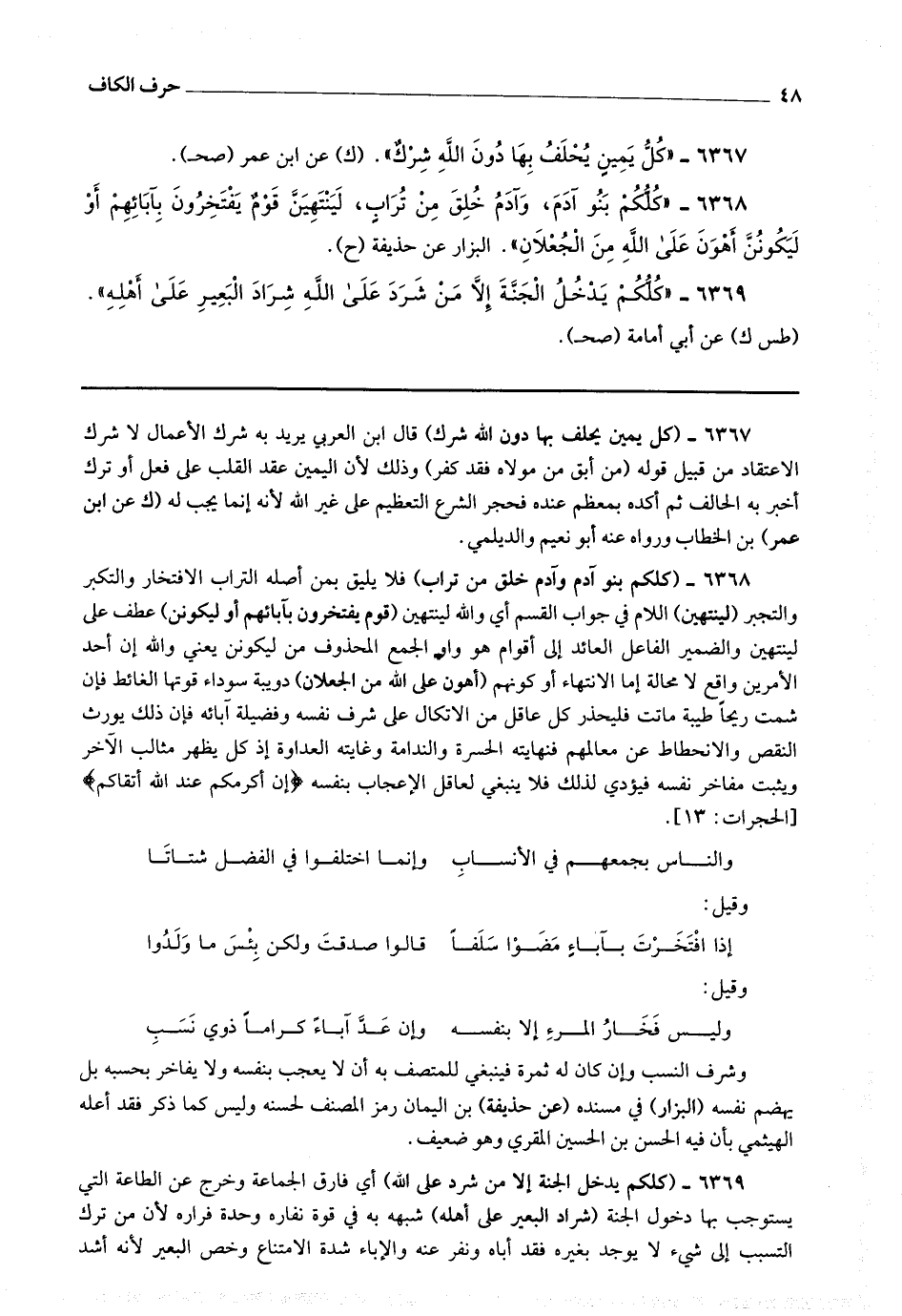 6368 - (كلكم بنو آدم وآدم خلق من تراب) فلا يليق بمن أصله التراب الافتخار والتكبر والتجبر (لينتهين) اللام في جواب القسم أي والله لينتهين (قوم يفتخرون بآبائهم أو ليكونن) عطف على لينتهين والضمير الفاعل العائد إلى أقوام هو واو الجمع المحذوف من ليكونن يعني والله إن أحد الأمرين واقع لا محالة إما الانتهاء أو كونهم (أهون على الله من الجعلان) دويبة سوداء قوتها الغائط فإن شمت ريحا طيبة ماتت فليحذر كل عاقل من الاتكال على شرف نفسه وفضيلة آبائه فإن ذلك يورث النقص والانحطاط عن معالمهم فنهايته الحسرة والندامة وغايته العداوة إذ كل يظهر مثالب الآخر ويثبت مفاخر نفسه فيؤدي لذلك فلا ينبغي لعاقل الإعجاب بنفسه * (إن أكرمكم عند الله أتقاكم) *.