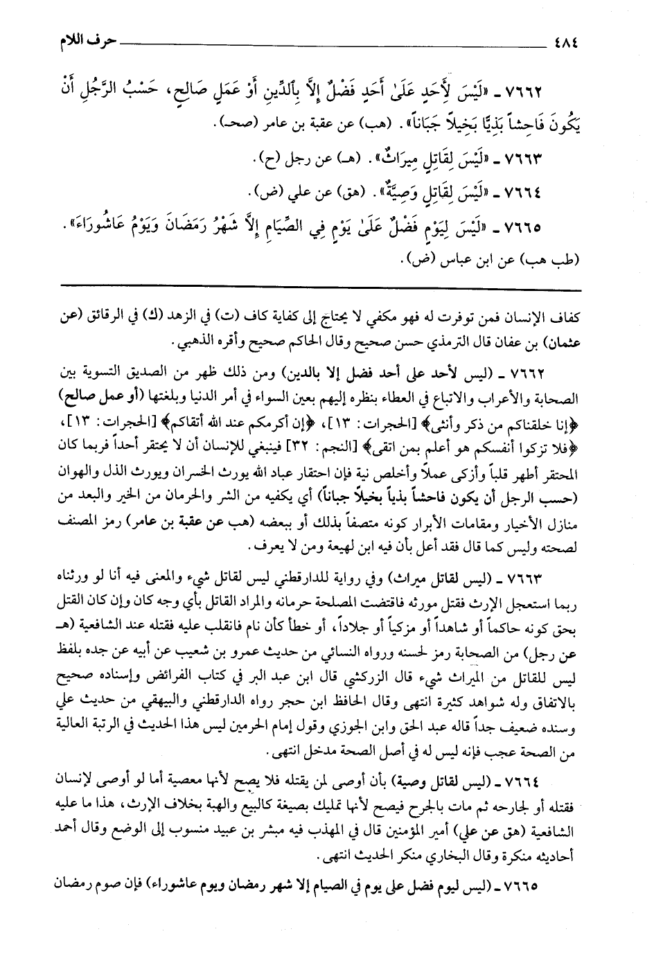 7663 - (ليس لقاتل ميراث) وفي رواية للدارقطني ليس لقاتل شئ والمعنى فيه أنا لو ورثناه ربما استعجل الإرث فقتل مورثه فاقتضت المصلحة حرمانه والمراد القاتل بأي وجه كان وإن كان القتل بحق كونه حاكما أو شاهدا أو مزكيا أو جلادا ، أو خطأ كأن نام فانقلب عليه فقتله عند الشافعية.
