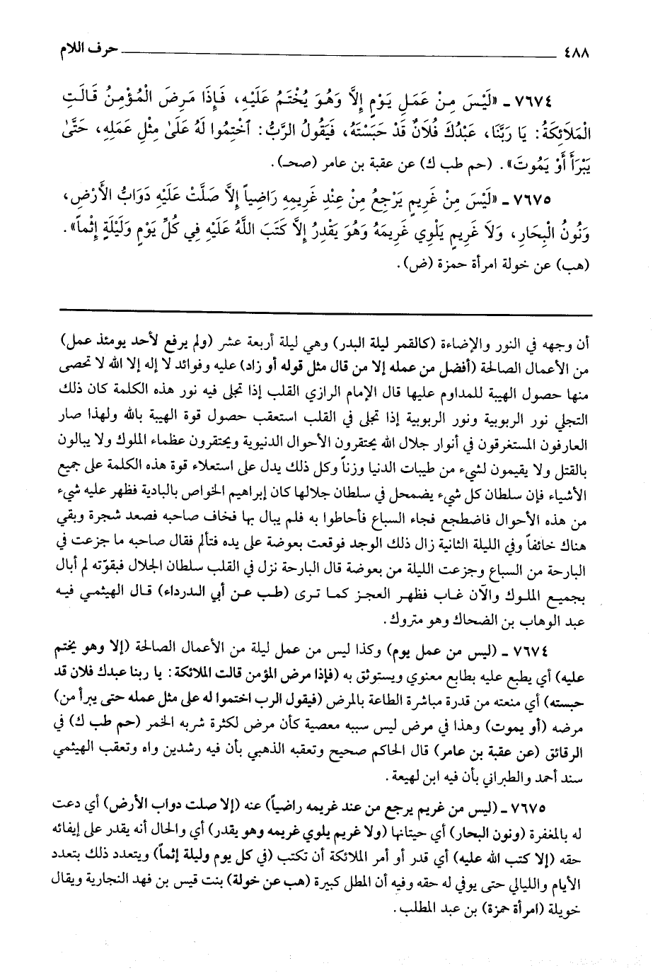7674 - (ليس من عمل يوم) وكذا ليس من عمل ليلة من الأعمال الصالحة (إلا وهو يختم عليه) أي يطبع عليه بطابع معنوي ويستوثق به (فإذا مرض المؤمن قالت الملائكة يا ربنا عبدك فلان قد حبسته) أي منعته من قدرة مباشرة الطاعة بالمرض (فيقول الرب اختموا له على مثل عمله حتى يبرأ) من مرضه (أو يموت) وهذا في مرض ليس سببه معصية كأن مرض لكثرة شربه الخمر.