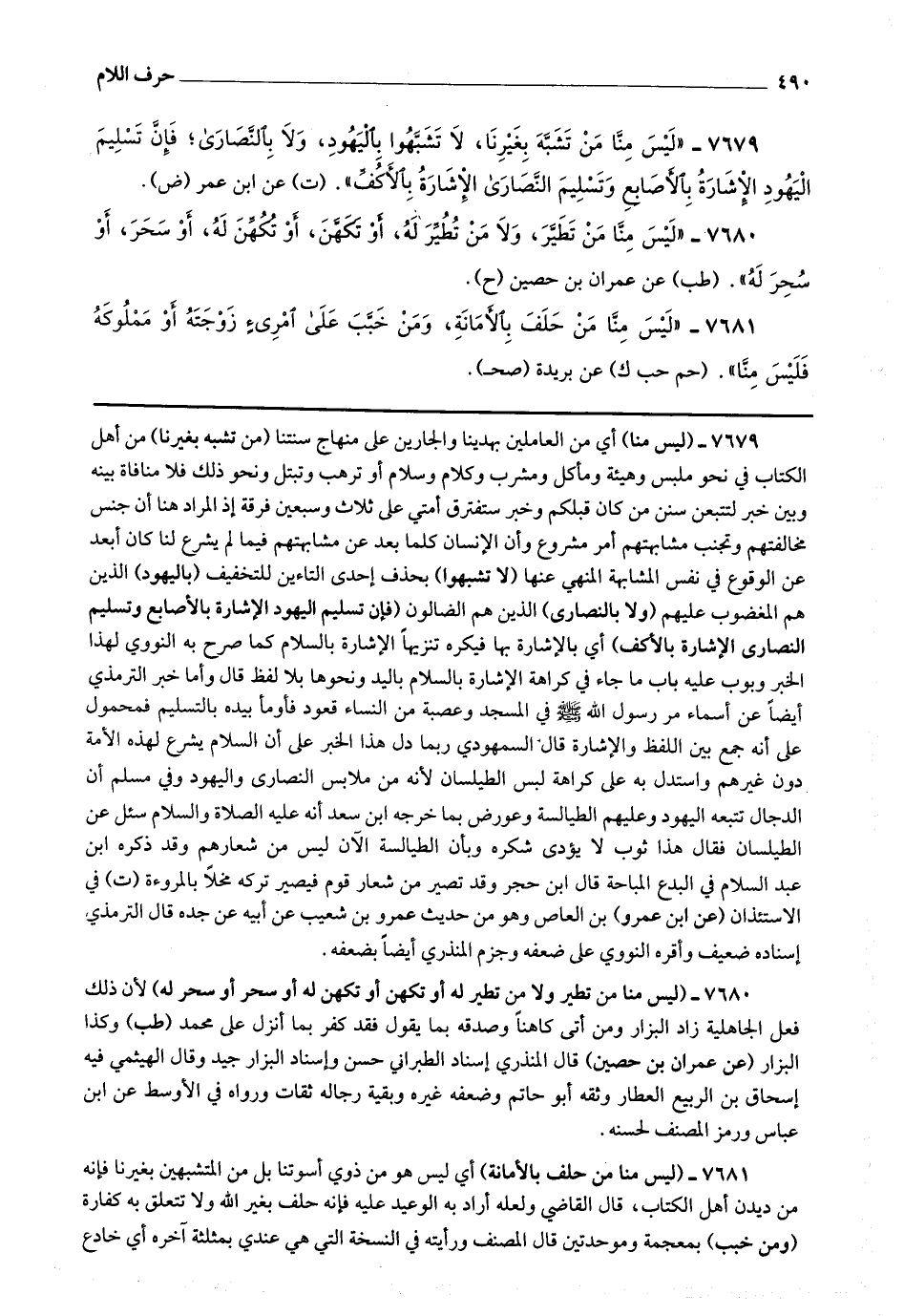 7679 - (ليس منا) أي من العاملين بهدينا والجارين على منهاج سنتنا (من تشبه بغيرنا) من أهل الكتاب في نحو ملبس وهيئة ومأكل ومشرب وكلام وسلام أو ترهب وتبتل ونحو ذلك فلا منافاة بينه وبين خبر لتتبعن سنن من كان قبلكم وخبر ستفترق أمتي على ثلاث وسبعين فرقة إذ المراد هنا أن جنس مخالفتهم وتجنب مشابهتهم أمر مشروع وأن الإنسان كلما بعد عن مشابهتهم فيما لم يشرع لنا كان أبعد عن الوقوع في نفس المشابهة المنهي عنها (لا تشبهوا) بحذف [ص 385] إحدى التاءين للتخفيف (باليهود) الذين هم المغضوب عليهم (ولا بالنصارى) الذين هم الضالون (فإن تسليم اليهود الإشارة بالأصابع وتسليم النصارى الإشارة بالأكف) أي بالإشارة بها فيكره تنزيها الإشارة بالسلام كما صرح به النووي لهذا الخبر وبوب عليه باب ما جاء في كراهة الإشارة بالسلام باليد ونحوها بلا لفظ قال: وأما خبر الترمذي أيضا عن أسماء مر رسول الله صلى الله عليه وآله وسلم في المسجد وعصبة من النساء قعود فأومأ بيده بالتسليم فمحمول على أنه جمع بين اللفظ والإشارة قال السمهودي: ربما دل هذا الخبر على أن السلام يشرع لهذه الأمة دون غيرهم واستدل به على كراهة لبس الطيلسان لأنه من ملابس النصارى واليهود وفي مسلم أن الدجال تتبعه اليهود وعليهم الطيالسة وعورض بما خرجه ابن سعد أنه عليه الصلاة والسلام سئل عن الطيلسان فقال: هذا ثوب لا يؤدى شكره وبأن الطيالسة الآن ليست من شعارهم وقد ذكره ابن عبد السلام في البدع المباحة قال ابن حجر: وقد تصير من شعار قوم فيصير تكه مخلا بالمروءة.