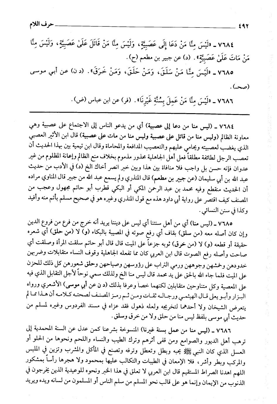 7684 - (ليس منا من دعا إلى عصبية) أي من يدعو الناس إلى الاجتماع على عصبية وهي معاونة الظالم (وليس منا من قاتل على عصبية وليس منا من مات على عصبية) قال ابن الأثير : العصبي الذي يغضب لعصبيته ويحامي عليهم والتعصيب المدافعة والمحاماة وقال ابن تيمية : بين بهذا الحديث أن تعصب الرجل لطائفة مطلقا فعل أهل الجاهلية محذور مذموم بخلاف منع الظالم وإعانة المظلوم من غير عدوان فإنه حسن بل واجب فلا منافاة بين هذا وبين خبر انصر أخاك إلخ.