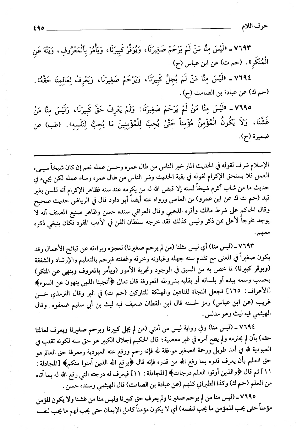 7695 - (ليس منا من لم يرحم صغيرنا ولم يعرف حق كبيرنا وليس منا من غشنا ولا يكون المؤمن مؤمنا حتى يحب للمؤمن ما يحب لنفسه) أي لا يكون مؤمنا كامل الإيمان حتى يحب لهم ما يحب لنفسه