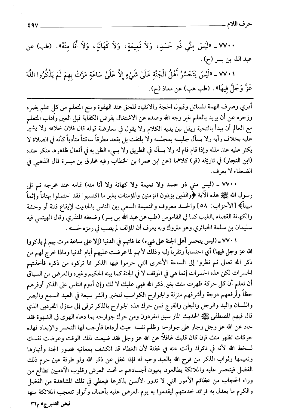 7701 - (ليس يتحسر أهل الجنة على شئ) مما فاتهم في الدنيا (إلا على ساعة مرت بهم لم يذكروا الله عز وجل فيها) أي احتسابا وتقربا إليه وذلك لأنهم لما عرضت عليهم أيام الدنيا وماذا خرج لهم من