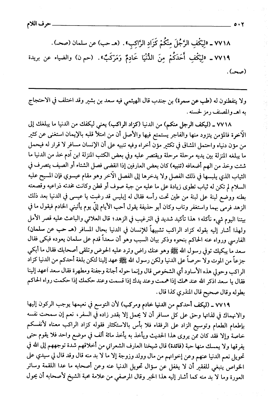 7719 - (ليكف أحدكم من الدنيا خادم ومركب) لأن التوسع في نعيمها يوجب الركون إليها والانهماك في لذاتها وحق على كل مسافر أن لا يحمل إلا بقدر زاده في السفر، نعم إن سمحت نفسه بإطعام الطعام وتوسيع الزاد على الرفقاء فلا بأس بالاستكثار فقوله كزاد الراكب معناه لأنفسكم خاصة وإلا فقد كان ممن يروي هذا الحديث ويأخذ به يأخذ مائة ألف في موضع واحد فلا يقوم حتى يفرقها ولا يمسك منها حبة (فائدة) قال شيخنا العارف الشعراني: من أخلاقهم شدة توجههم إلى الله في تحويل نعم الدنيا عنهم وعن إخوانهم من مال وولد وزوجة إلا ما لا بد منه قال: وقد قال لي سيدي علي الخواص: ينبغي للفقير أن لا يغفل عن سؤال تحويل الدنيا عنه وعن أصحابه ما عدا اللقمة وساتر العورة وما لا بد منه كما أشار إليه هذا الخبر وقال المرصفي: من علامة محبة الشيخ لأصحابه أن يحول