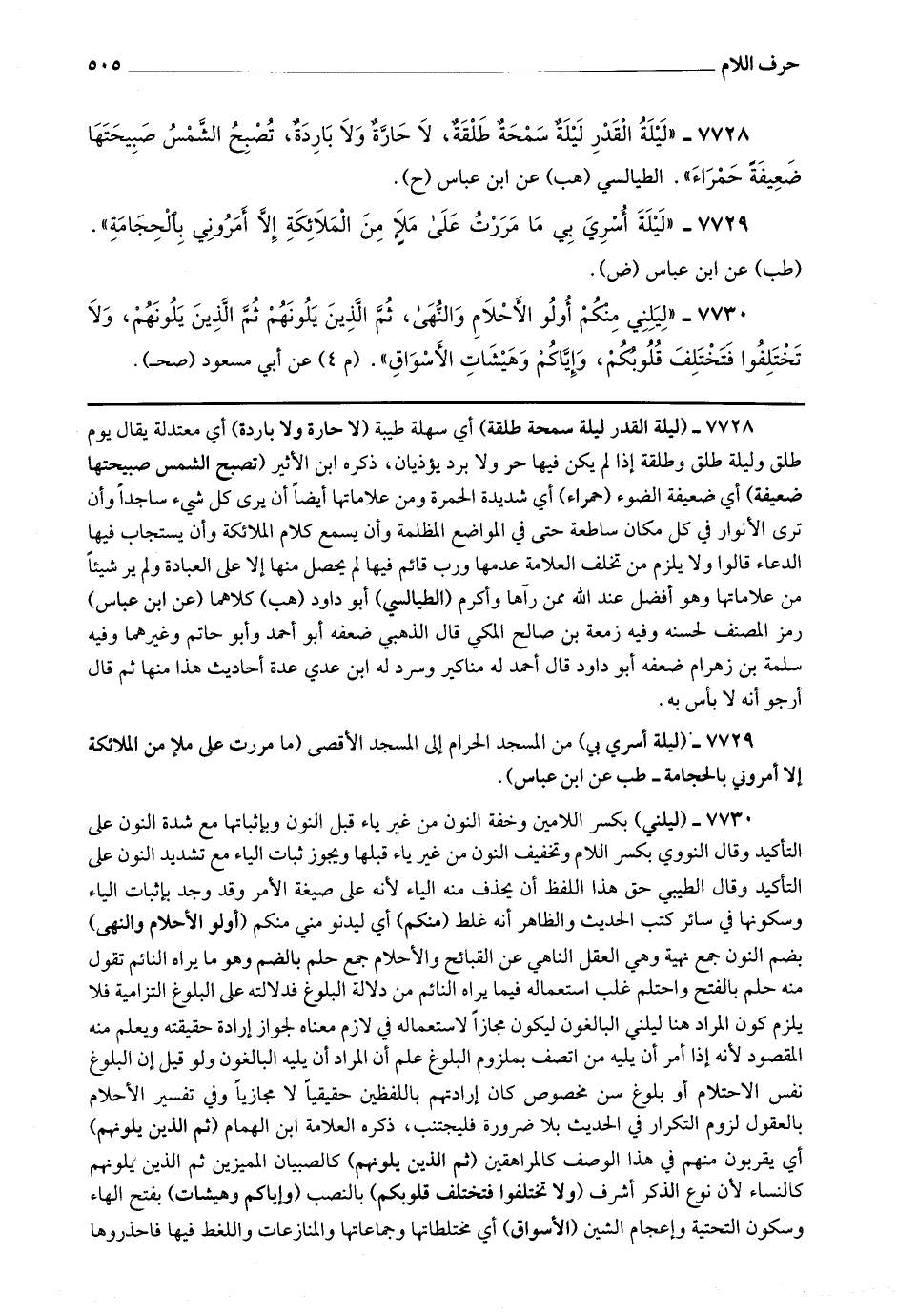 7728 - (ليلة القدر ليلة سمحة طلقة) أي سهلة طيبة (لا حارة ولا باردة) أي معتدلة يقال يوم طلق وليلة طلق وطلقة إذا لم يكن فيها حر ولا بريؤذيان، ذكره ابن الأثير (تصبح الشمس صبيحتها ضعيفة) أي ضعيفة الضوء (حمرا) أي شديدة الحمرة ومن علاماتها أيضا أن يرى كل شئ ساجدا وأن ترى الأنوار في كمكان ساطعة حتى في المواضع المظلمة وأن يسمع كلام الملائكة وأن يستجاب فيها