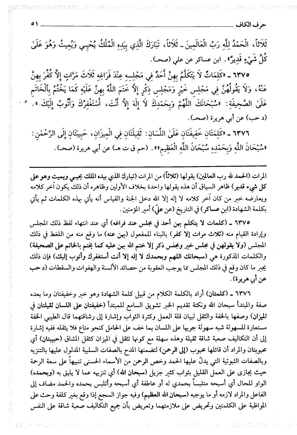 6376 - (كلمتان) أراد بالكلمة الكلام من قبيل كلمة الشهادة وهو خبر وخفيفتان وما بعده صفة والمبتدأ سبحان الله ونكتة تقديم الخبر تشويق السامع للمبتدأ (خفيفتان على اللسان ثقيلتان في الميزان) وصفها بالخفة والثقل لبيان قلة العمل وكثرة الثواب وإشارة إلى رشاقتهما قال الطيبي : الخفة مستعارة للسهولة شبه سهولة جريها على اللسان بما خف على الحامل كنحو متاع فلا يثقله ففيه إشارة إلى أن التكاليف صعبة شاقة ثقيلة وهذه سهلة مع كونها تثقل في الميزان كثقل المشاق (حبيبتان) أي محبوبتان والمراد أن قائلها محبوب (إلى الرحمن) لتضمنها المدح بالصفات السلبية المدلول عليها بالتنزيه