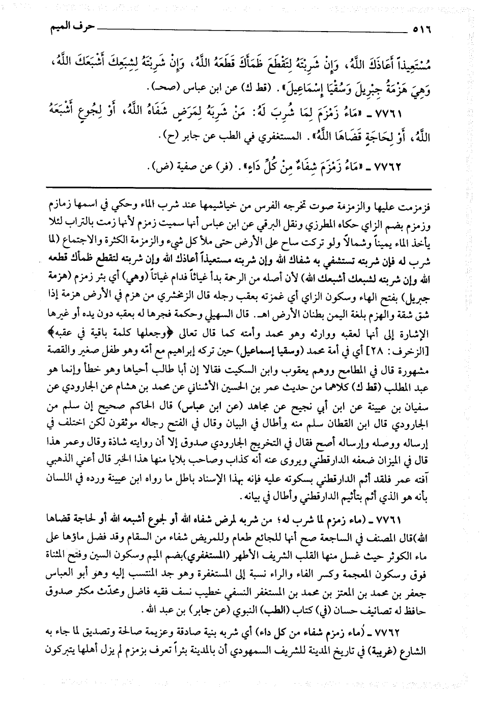 7761 - (ماء زمزم لما شرب له : من شربه لمرض شفاه الله أو لجوع أشبعه الله أو لحاجة قضاها الله) قال المصنف في الساجعة : صح أنها للجائع طعام وللمريض شفاء من السقام وقد فضل ماؤها على ماء الكوثر حيث غسل منها القلب الشريف الأطهر.