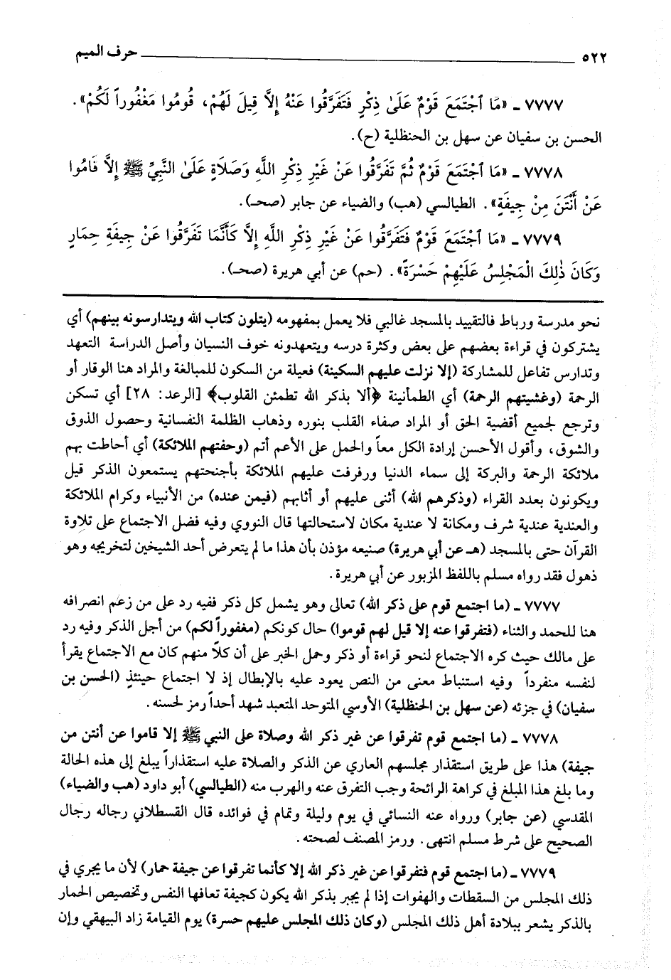 7777 - (ما اجتمع قوم على ذكر الله) تعالى وهو يشمل كل ذكر ففيه رد على من زعم انصرافه هنا للحمد والثناء (فتفرقوا عنه إلا قيل لهم قوموا) حال كونكم (مغفورا لكم) من أجل الذكر وفيه رد على مالك حيث كره الاجتماع لنحو قراءة أو ذكر وحمل الخبر على أن كلا منهم كان مع الاجتماع يقرأ لنفسه منفردا وفيه استنباط معنى من النص يعود عليه بالإبطال إذ لا اجتماع حينئذ.