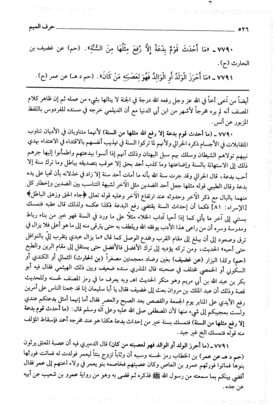 7790 - (ما أحدث قوم بدعة إلا رفع الله مثلها من السنة) لأنهما متناوبان في الأديان تناوب المتقابلات في الأجسام ذكره الحرالي ولأنهم لما تركوا السنة في تهذيب أنفسهم بالإقتداء في الاهتداء بهدي نبيهم تولاهم الشيطان ، وسلك بهم سبل البهتان ، وذلك أنهم إذا أنسوا ببدعتهم واطمأنوا إليها جرهم ذلك إلى الاستهانة بالنسبة وإضاعتها وما كذب أحد بحق إلا عوقب بتصديقه بباطل وما ترك سنة إلا أحب بدعة ، قال الحرالي : وقد جرت سنة الله بأنه ما أمات أحد سنة إلا زاد في خذلانه بأن تحيا على يده بدعة وقال الطيبي : قوله مثلها جعل أحد الضدين مثل الآخر لشبهة التناسب بين الضدين وإخطار كل منهما بالبال مع ذكر الآخر وحدوثه عند ارتفاع الآخر وعليه قوله تعالى * (جاء الحق وزهق الباطل) *