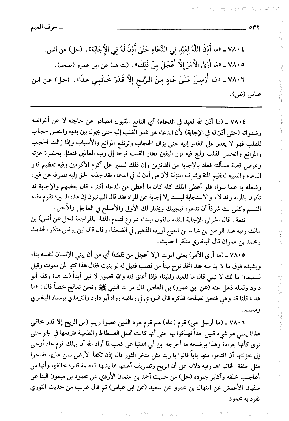 7804 - (ما أذن الله لعبد في الدعاء) أي النافع المقبول الصادر عن حاجته لا عن أغراضه وشهواته (حتى أذن له في الإجابة) لأن الدعاء هو غدو القلب إليه حتى يجول بين يديه والنفس حجاب للقلب فهو لا يقدر على الغدو إليه حتى يزال الحجاب وترتفع الموانع والأسباب وإذا زالت الحجب والموانع وانحسر القلب ولج فيه نور اليقين فطار القلب فرحا إلى رب العالمين فتمثل بحضرة عزته وعرض قصة مسألته فعاد بالإجابة من الفائزين وإن ذلك ليسير على أكرم الأكرمين وفيه تعظيم قدر الدعاء والتنبيه لعظيم المنة وشرف المنزلة لأن من أذن له في الدعاء فقد جذبه الحق إليه فصرفه عن غيره وشغله به عما سواه فلو أعطى الملك كله كان ما أعطى من الدعاء أكثر ، قال بعضهم : والإجابة قد