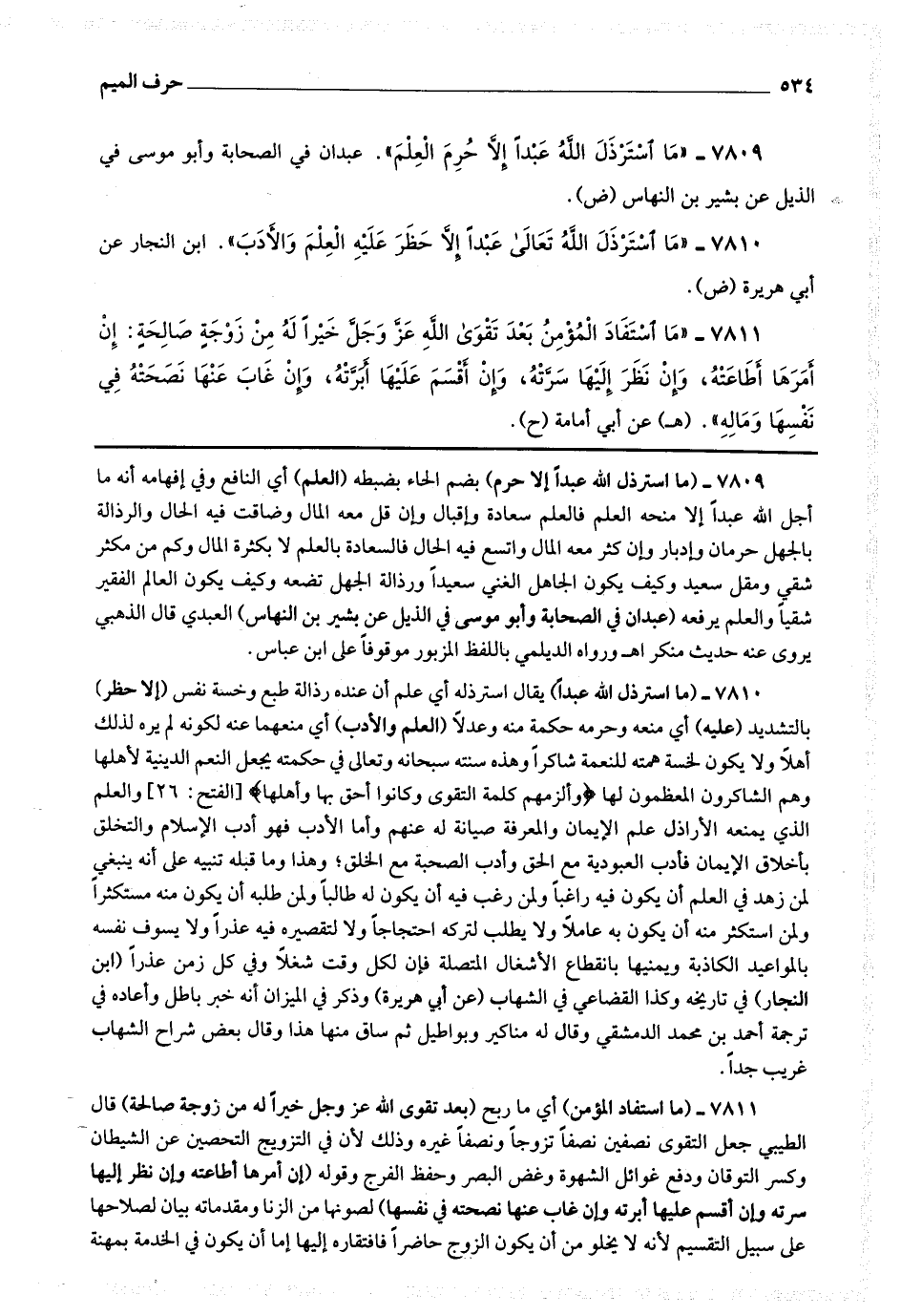 7809 - (ما استرذل الله عبدا إلا حرم) بضم الحاء بضبطه (العلم) أي النافع وفي إفهامه أنه ما أجل الله عبدا إلا منحه العلم فالعلم سعادة وإقبال وإن قل معه المال وضاقت فيه الحال والرذالة بالجهل حرمان وإدبار وإن كثر معه المال واتسع فيه الحال فالسعادة بالعلم لا بكثرة المال وكم من مكثر شقي ومقل سعيد ، وكيف يكون الجاهل الغني سعيدا ورذالة الجهل تضعه ، وكيف يكون العالم الفقير شقيا والعلم يرفعه.