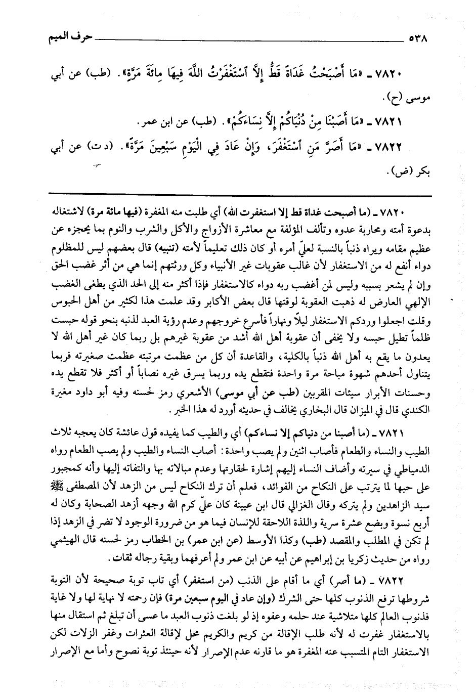 7820 - (ما أصبحت غداة قط إلا استغفرت الله) أي طلبت منه المغفرة (فيها مائة مرة) لاشتغاله بدعوة أمته ومحاربة عدوه وتألف المؤلفة مع معاشرة الأزواج والأكل والشرب والنوم بما يحجزه عن عظيم مقامه ويراه ذنبا بالنسبة لعلي أمره أو كان ذلك تعليما لأمته.