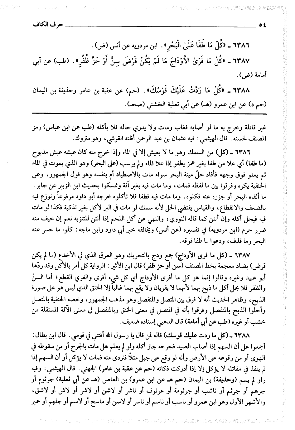 6386 - (كل) من السمك وهو ما لا يعيش إلا في الماء وإذا خرج منه كان عيشه عيش مذبوح (ما طفا) أي علا من طفا بغير همز يطفو إذا علا الماء ولم يرسب (على البحر) وهو الذي يموت في الماء ثم يعلو فوق وجهه فأفاد حل ميتة البحر سواء مات بالاصطياد أم بنفسه وهو قول الجمهور ، وعن الحنفية يكره وفرقوا بين ما لفظه فمات ، وما مات بغير آفة وتمسكوا بحديث ابن الزبير عن جابر : ما ألقاه البحر أو جزره فكلوه.