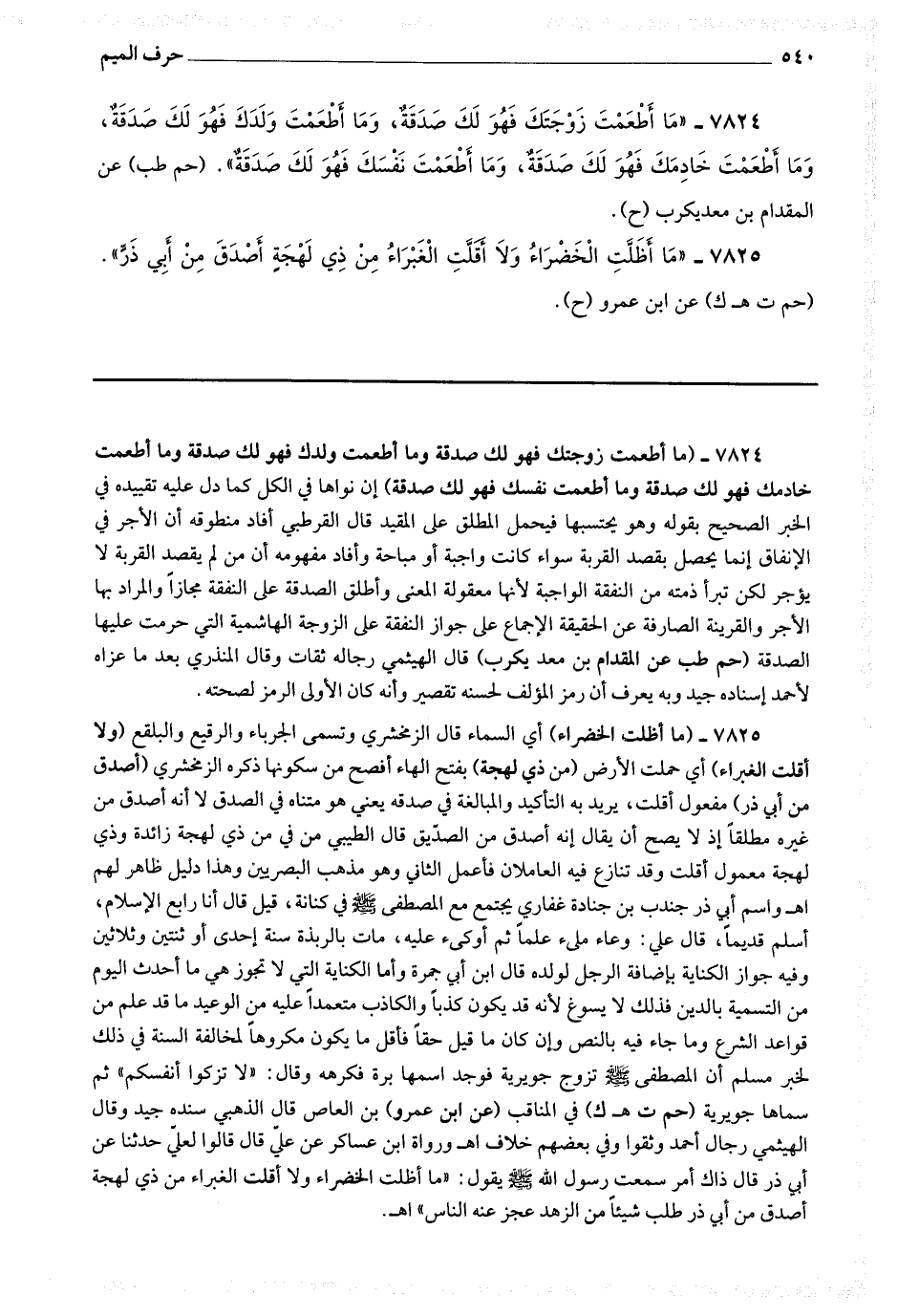 7824 - (ما أطعمت زوجتك فهو لك صدقة وما أطعمت ولدك فهو لك صدقة وما أطعمت خادمك فهو لك صدقة وما أطعمت نفسك فهو لك صدقة) إن نواه في الكل كما دل عليه تقييده في الخبر الصحيح بقوله وهو يحتسبها فيحمل المطلق على المقيد قال القرطبي : أفاد منطوقه أن الأجر في الإنفاق إنما يحصل بقصد القربة سواء كانت واجبة أو مباحة وأفاد مفهومه أن من لم يقصد القربة لا يؤجر لكن تبرأ ذمته من النفقة الواجبة لأنها معقولة المعنى وأطلق الصدقة على النفقة مجازا والمراد بها الأجر والقرينة الصارفة عن الحقيقة الإجماع على جواز النفقة على الزوجة الهاشمية التي حرمت عليها الصدقة.
