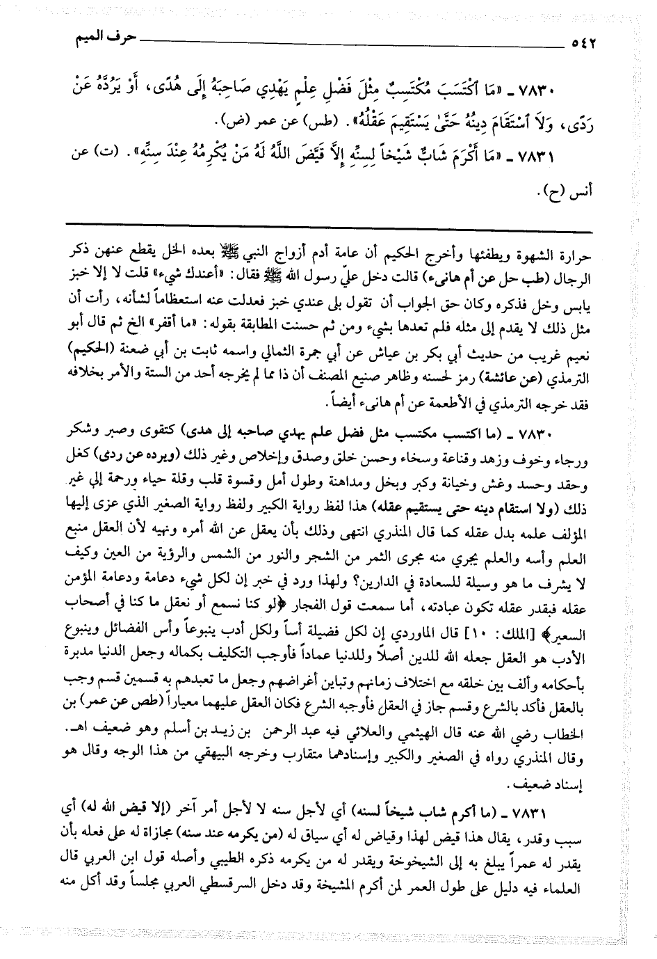 7830 - (ما اكتسب مكتسب مثل فضل علم يهدي صاحبه إلى هدى) كتقوى وصبر وشكر ورجاء وخوف وزهد وقناعة [ ص 425 ] وسخاء وحسن خلق وصدق إخلاص وغير ذلك (ويرده عن ردى) كغل وحقد وحسد وغش وخيانة وكبر وبخل ومداهنة وطول أمل وقسوة قلب وقلة حياء ورحمة إلى غير ذلك (ولا استقام دينه حتى يستقيم عقله) هذا لفظ رواية الكبير ولفظ رواية الصغير الذي عزى إليها