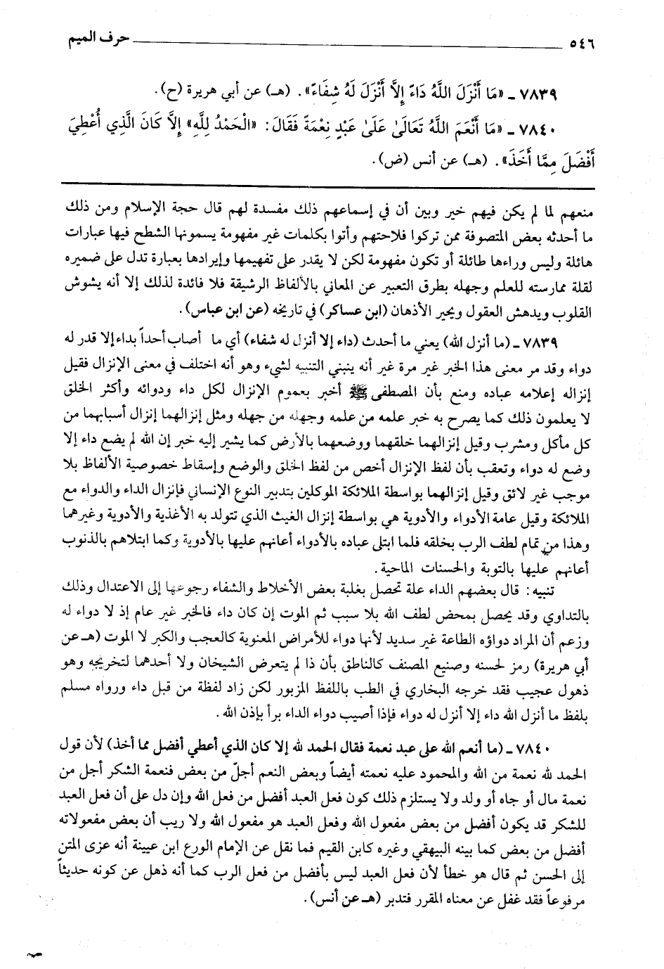 7840 - (ما أنعم الله على عبد نعمة فقال الحمد لله إلا كان الذي أعطى أفضل مما أخذ) لأن قول الحمد لله نعمة من الله والمحمود عليه نعمته أيضا وبعض النعم أجل من بعض فنعمة الشكر أجل من نعمة مال أو جاه أو ولد ولا يستلزم ذلك كون فعل العبد أفضل من فعل الله وإن دل على أن فعل العبد للشكر قد يكون أفضل من بعض مفعول الله وفعل العبد هو مفعول الله ولا ريب أن بعض مفعولاته أفضل من بعض كما بينه البيهقي وغيره كابن القيم فما نقل عن الإمام الورع ابن عيينة أنه عزى المتن إلى الحسن ثم قال هو خطأ لأن فعل العبد ليس بأفضل من فعل الرب كما أنه ذهل عن كونه حديثا مرفوعا فقد غفل عن معناه المقرر فتدبر.