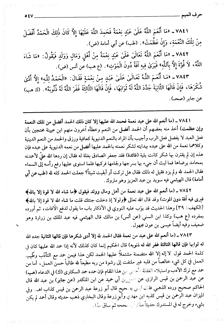 7841 - (ما أنعم الله على عبد نعمة فحمد الله عليها إلا كان ذلك الحمد أفضل من تلك النعمة وإن عظمت) أخذ منه بعضهم أن الحمد أفضل من النعم وخطأ آخرون منهم ابن عيينة محتجين بأن فعل العبد لا يفضل فعل الرب وأجيب بأن المراد بالنعم الدنيوية كعافية ورزق والحمد من النعم الدينية وكلاهما نعمة من الله على عبده بهدايته لشكر نعمته بالحمد عليها أفضل من نعمه الدنيوية على عبده فإن هذه إن لم يقترن بها شكر كانت بلية (فائدة) فقد جعفر الصادق بغلة له فقال : إن ردها الله علي لأحمدنه بمحامد يرضاها فما لبث أن جئ بها بسرجها ولجامها فركبها فلما استوى عليها رفع رأسه إلى السماء