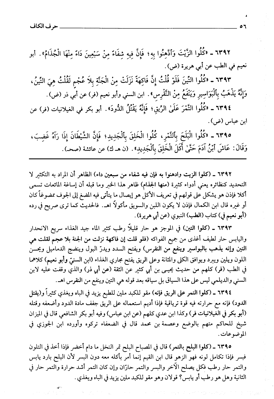 6393 - (كلوا التين) في الموجز هو حار قليلا رطب كثير الماء جيد الغذاء سريع الانحدار واليابس حار لطيف أغذى من جميع الفواكه (فلو قلت إن فاكهة نزلت من الجنة بلا عجم لقلت هي