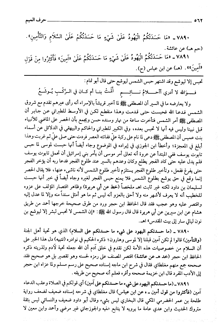 7890 - (ما حسدتكم اليهود على شئ ما حسدتكم على السلام) الذي هو تحية أهل الجنة (والتأمين) قالوا لم تكن آمين قبلنا إلا لموسى وهارون ذكره الحكيم في نوادره.