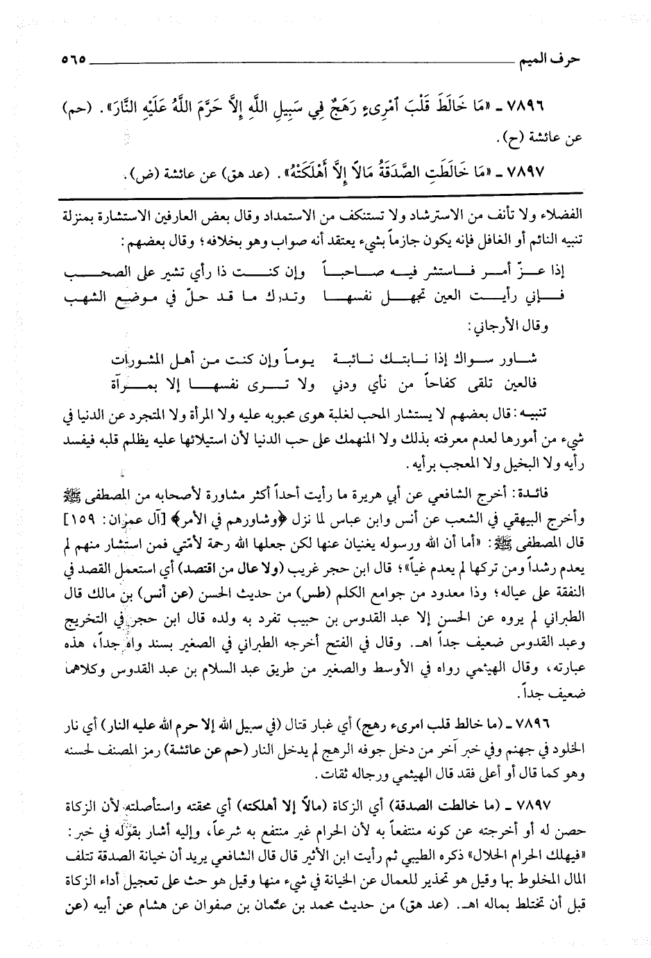 الفضلاء ولا تأنف من الاسترشاد ولا تستنكف من الاستمداد وقال بعض العارفين : الاستشارة بمنزلة تنبيه النائم أو الغافل فإنه يكون جازما بشئ يعتقد أنه صواب وهو بخلافه ، وقال بعضهم : إذا عز أمر فاستشر فيه صاحبا * وإن كنت ذا رأي تشير على الصحب فإني رأيت العين تجهل نفسها * وتدرك ما قد حل في موضع الشهب وقال الأرجاني : شاور سواك إذا نابتك نائبة * يوما وإن كنت من أهل المشورات فالعين تلقى كفاحا من نأى ودنى * ولا ترى نفسها إلا بمرآة تنبيه : قال بعضهم : لا يستشار المحب لغلبة هوى محبوبه عليه ولا المرأة ولا المتجرد عن الدنيا في شئ من أمورها لعدم [ ص 443 ] معرفته بذلك ولا المنهمك على حب الدنيا لأن استيلائها عليه يظلم قلبه فيفسد رأيه ولا البخيل ولا المعجب برأيه.