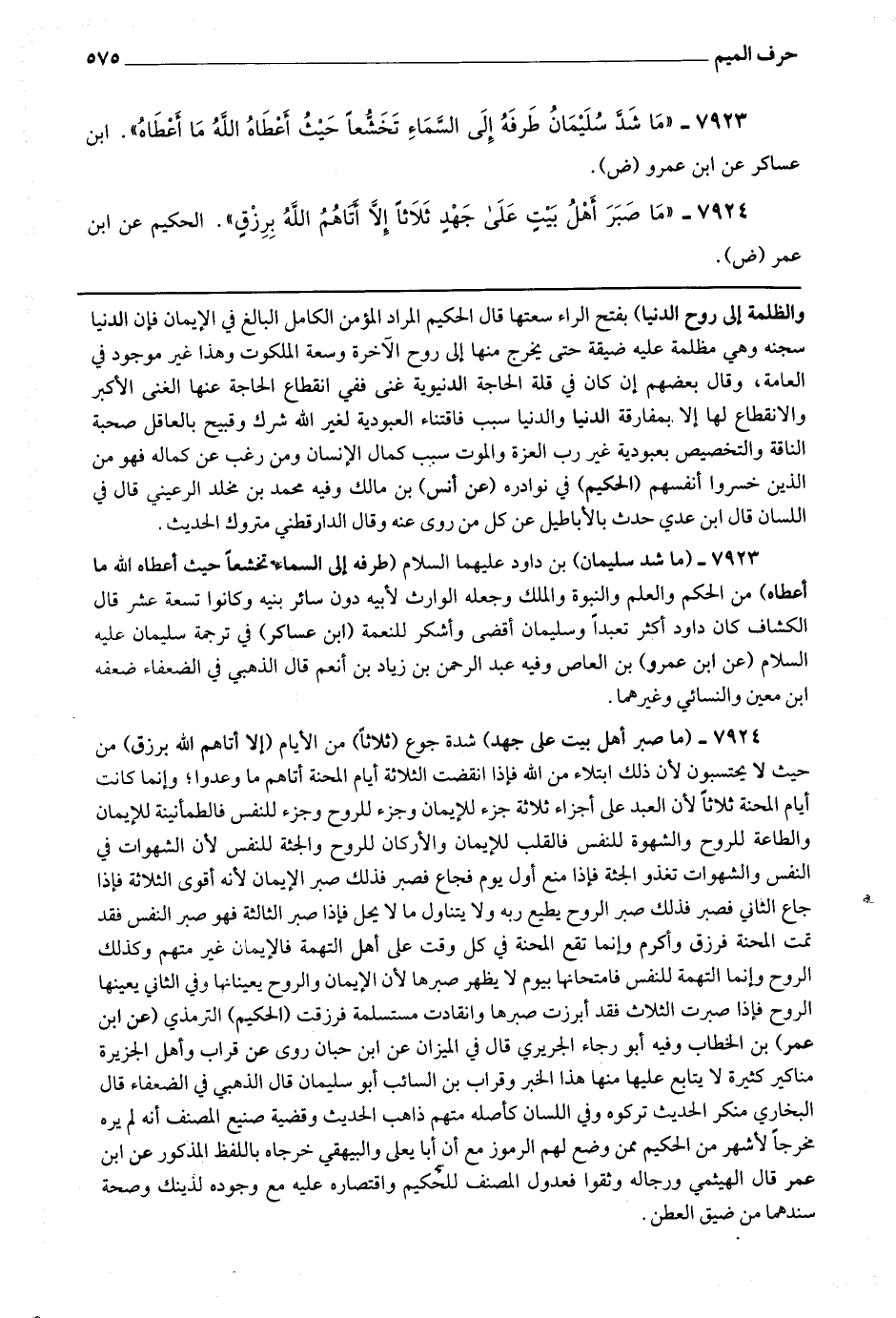 7924 - (ما صبر أهل بيت على جهد) شدة جوع (ثلاثا) من الأيام (إلا أتاهم الله برزق) من حيث لا يحتسبون لأن ذلك ابتلاء من الله فإذا انقضت الثلاثة أيام المحنة أناهم ما وعدوا وإنما كانت أيام المحنة ثلاثا لأن العبد على أجزاء ثلاثة جزء للإيمان وجزء للروح وجزء للنفس فالطمأنينة للإيمان والطاعة للروح والشهوة للنفس فالقلب للإيمان والأركان للروح والجنة للنفس لأن الشهوات في النفس والشهوات تغذو الجثة فإذا منع أول يوم فجاع فصبر فذلك صبر الإيمان لأنه أقوى الثلاثة فإذا جاع الثاني فصبر فذلك صبر الروح يطيع ربه ولا يتناول ما لا يحل فإذا صبر الثالثة فهو صبر النفس فقد تمت المحنة فرزق وأكرم وإنما تقع المحنة في كل وقت على أهل التهمة فالإيمان غير متهم وكذلك الروح وإنما التهمة للنفس فامتحانها بيوم لا يظهر صبرها لأن الإيمان والروح يعينانها وفي الثاني يعينها الروح فإذا صبرت الثلاث فقد أبرزت صبرها وانقادت مستسلمة فرزقت.