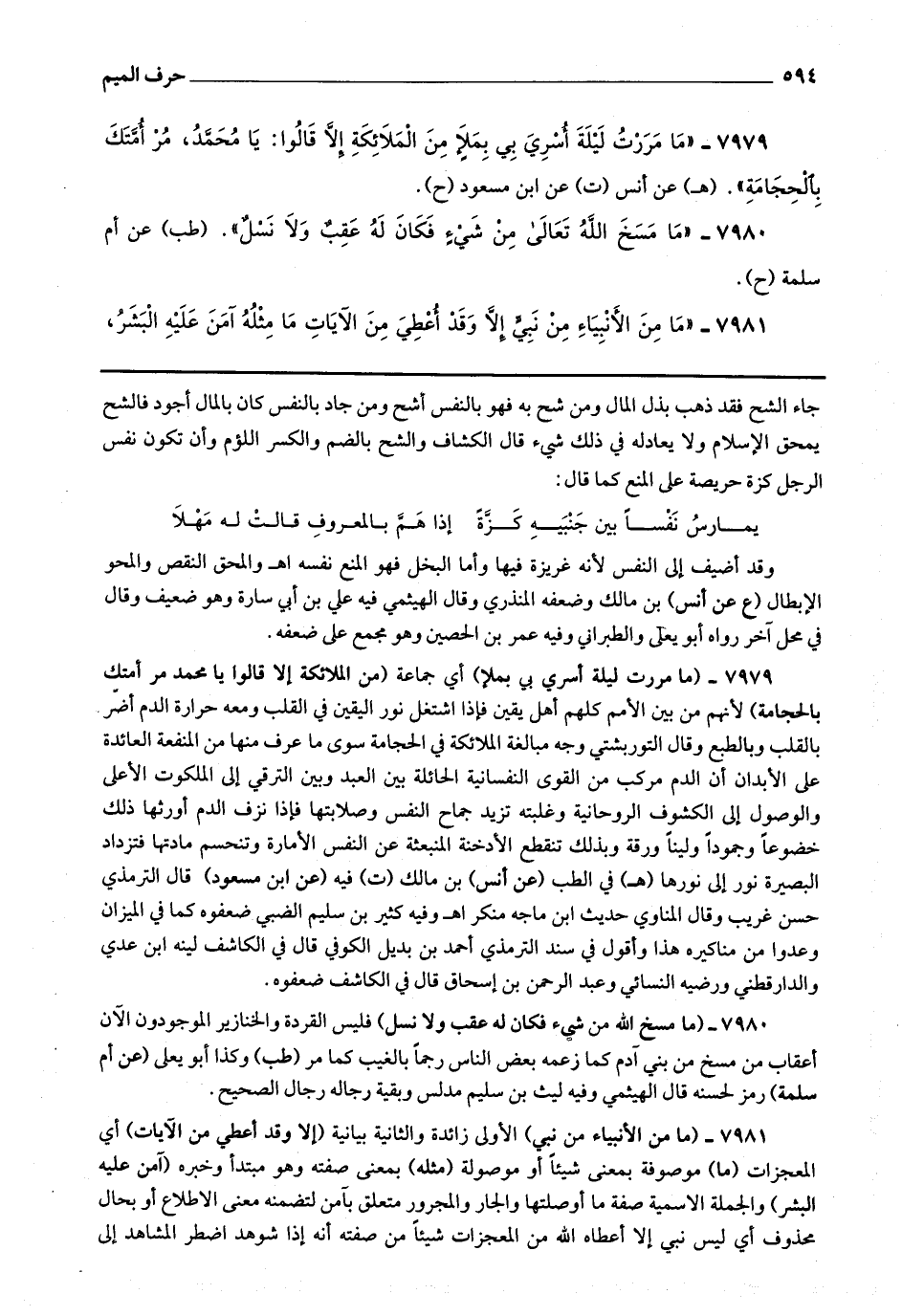 7979 - (ما مررت ليلة أسري بي بملأ) أي جماعة (من الملائكة إلا قالوا يا محمد مر أمتك بالحجامة) لأنهم من بين الأمم كلهم أهل يقين فإذا اشتغل نور اليقين في القلب ومعه حرارة الدم أضر بالقلب وبالطبع وقال التوربشتي : وجه مبالغة الملائكة في الحجامة سوى ما عرف منها من المنفعة العائدة على الأبدان أن الدم مركب من القوى النفسانية الحائلة بين العبد وبين الترقي إلى الملكوت الأعلى والوصول إلى الكشوف الروحانية وغلبته تزيد جماح النفس وصلابتها فإذا نزف الدم أورثها ذلك خضوعا وجمودا ولينا ورقة وبذلك تنقطع الأدخنة المنبعثة عن النفس الأمارة وتنحسم مادتها فتزداد البصيرة نور إلى نورها.