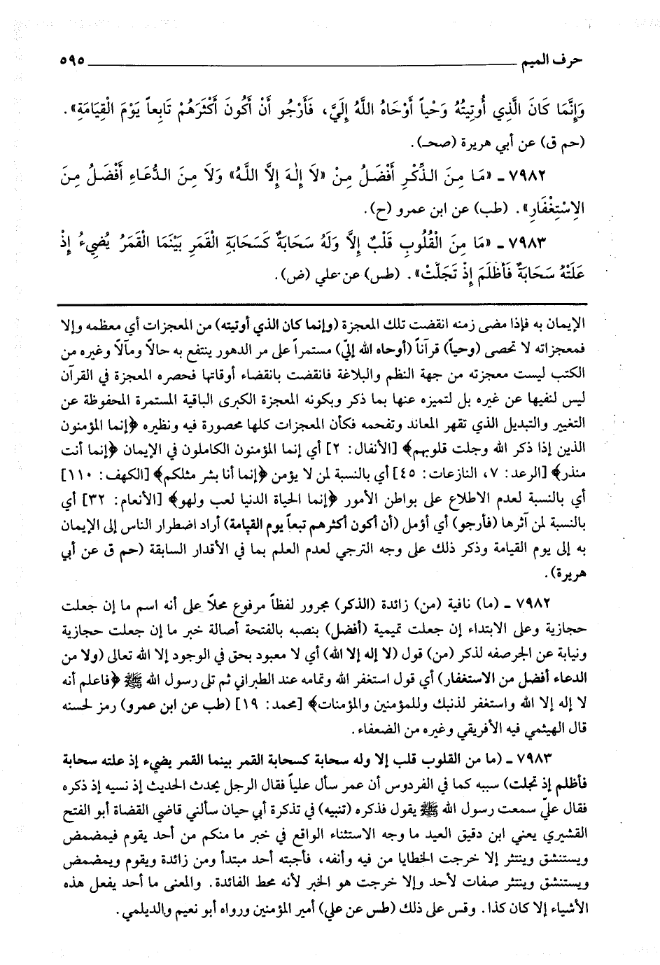 7983 - (ما من القلوب قلب إلا وله سحابة كسحابة القمر بينما القمر يضئ إذ علته سحابة فأظلم إذ تجلت) سببه كما في الفردوس أن عمر سأل عليا فقال الرجل يحدث الحديث إذ نسيه إذ ذكره فقال علي سمعت رسول الله صلى الله عليه وسلم يقول فذكره.