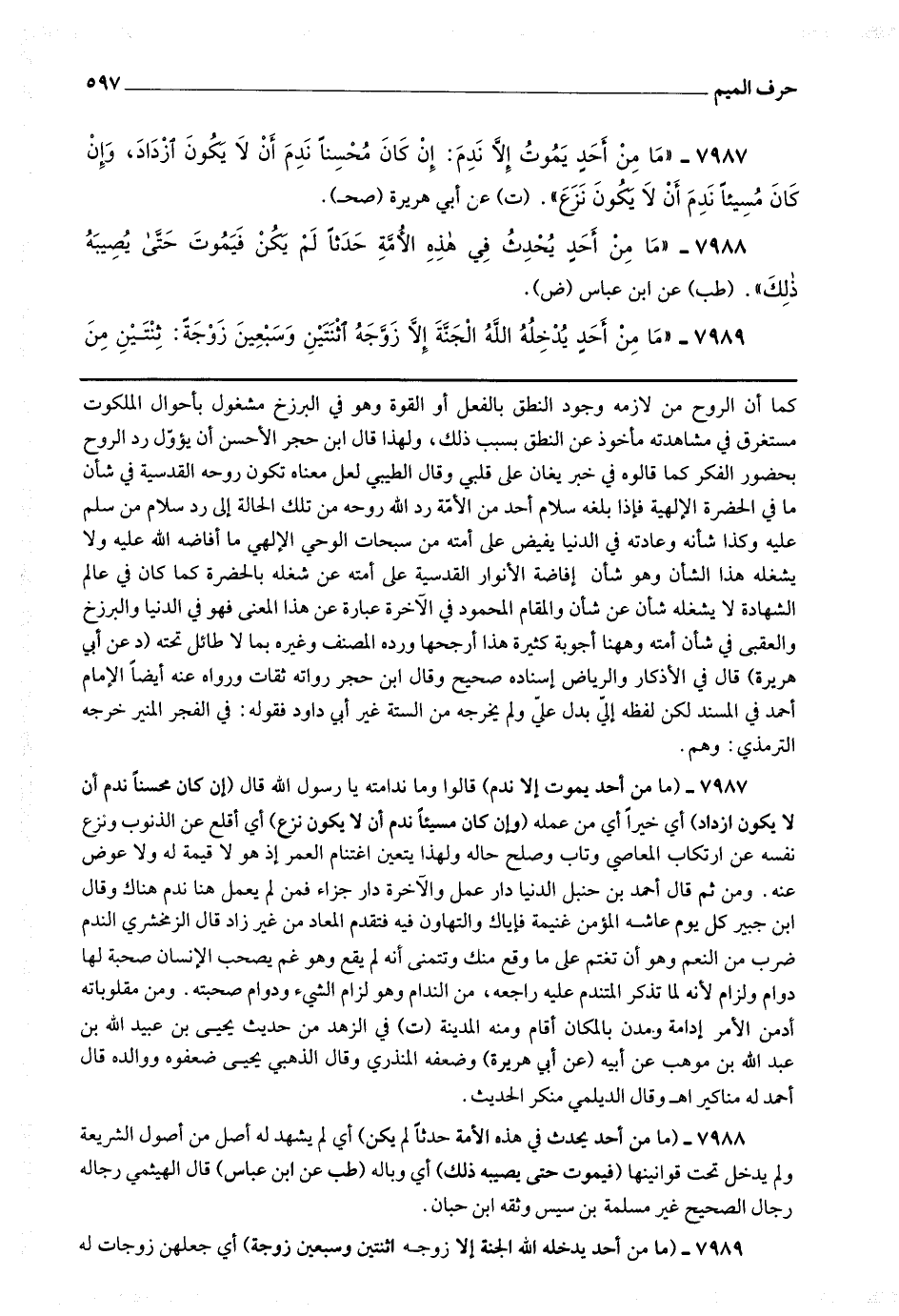 7987 - (ما من أحد يموت إلا ندم) قالوا : وما ندامته يا رسول الله قال : (إن كان محسنا ندم أن لا يكون ازداد) أي خيرا أي من عمله (وإن كان مسيئا ندم أن لا يكون نزع) أي أقلع عن الذنوب ونزع نفسه عن ارتكاب المعاصي وتاب وصلح حاله ولهذا يتعين اغتنام العمر إذ هو لا قيمة له ولا عوض عنه.
