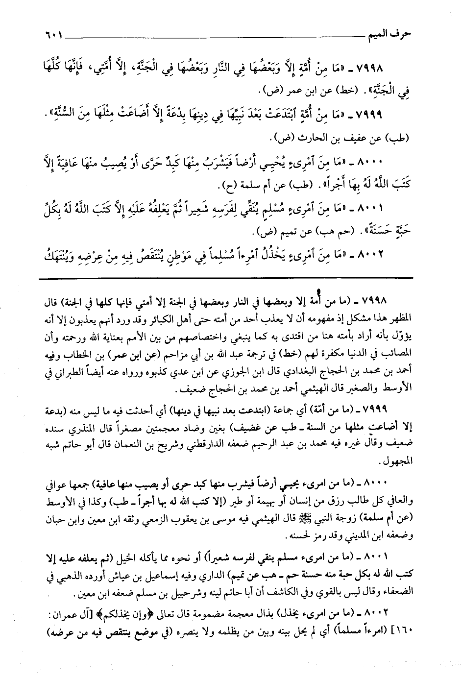 7998 - (ما من أمة إلا وبعضها في النار وبعضها في الجنة إلا أمتي فإنها كلها في الجنة) قال المظهر : هذا مشكل إذ مفهومه [ ص 471 ] أن لا يعذب أحد من أمته حتى أهل الكبائر وقد ورد أنهم يعذبون إلا أنه يؤول بأنه أراد بأمته هنا من اقتدى به كما ينبغي واختصاصهم من بين الأمم بعناية الله ورحمته وأن المصائب في الدنيا مكفرة لهم.